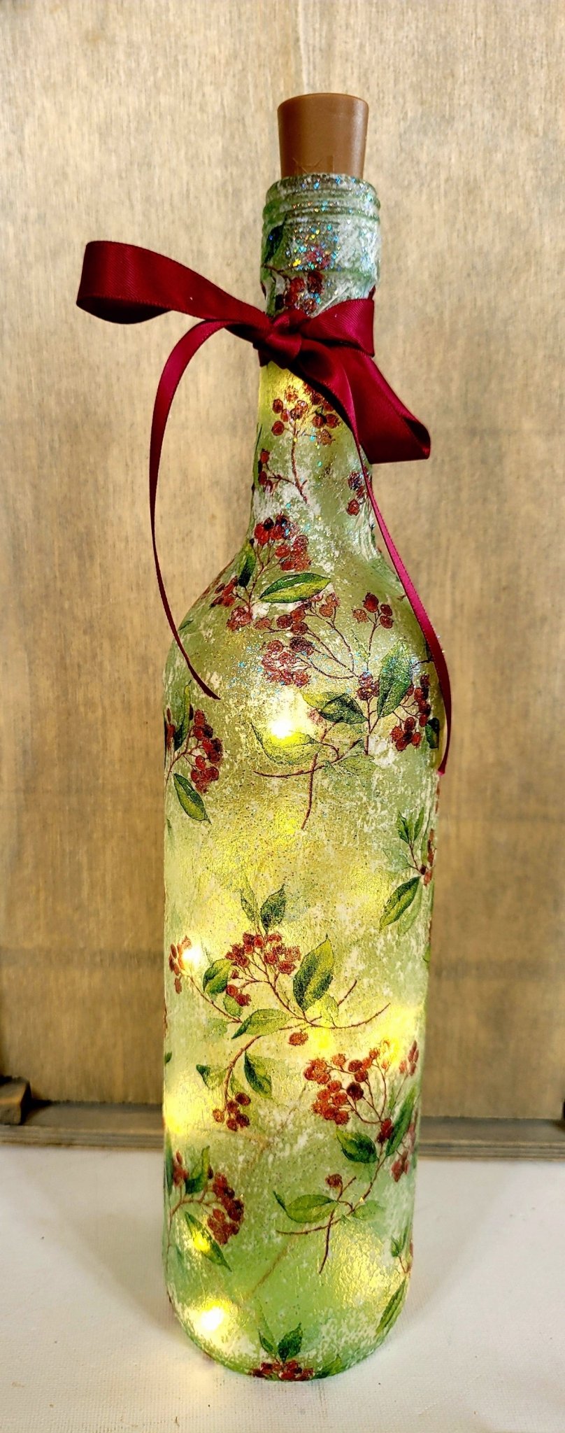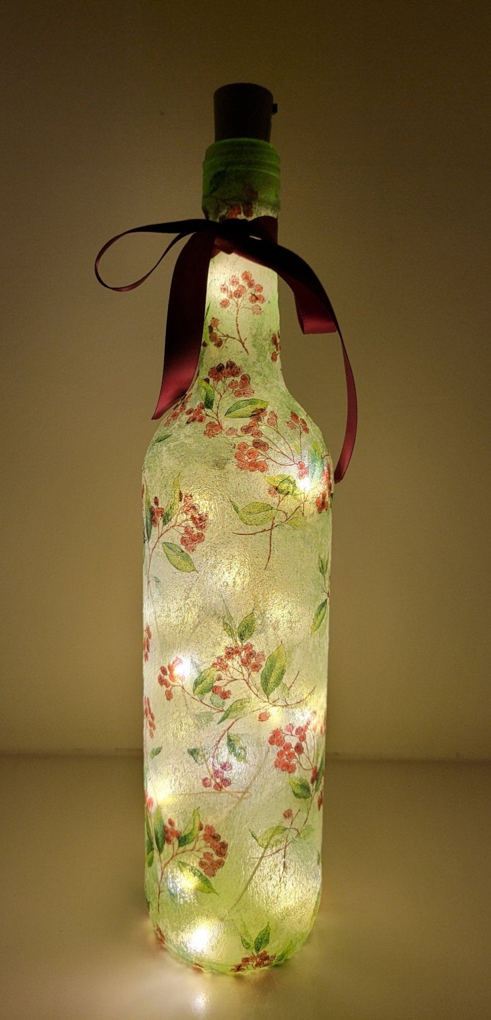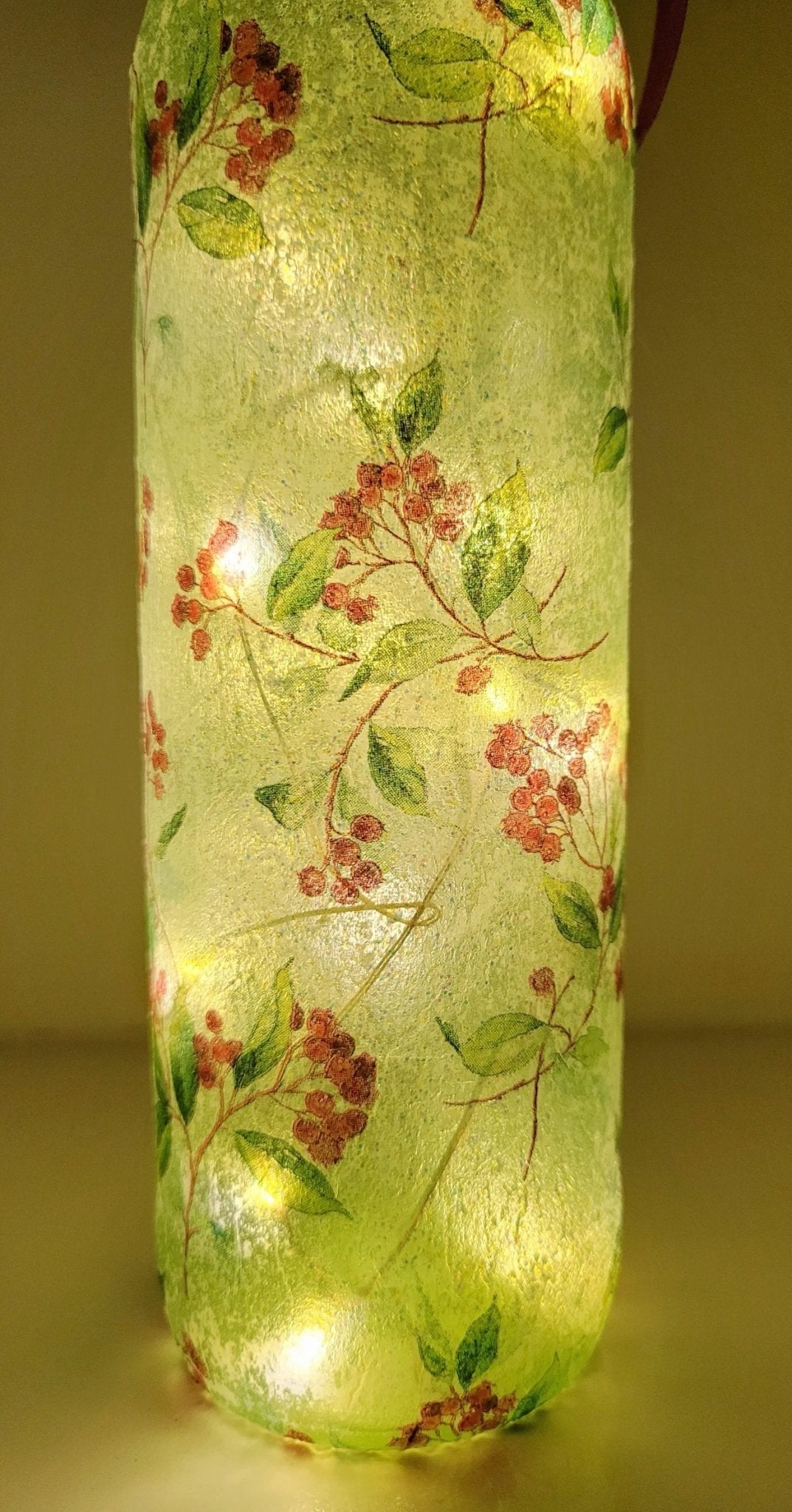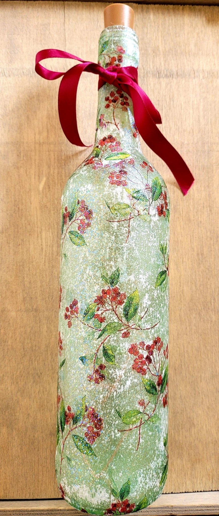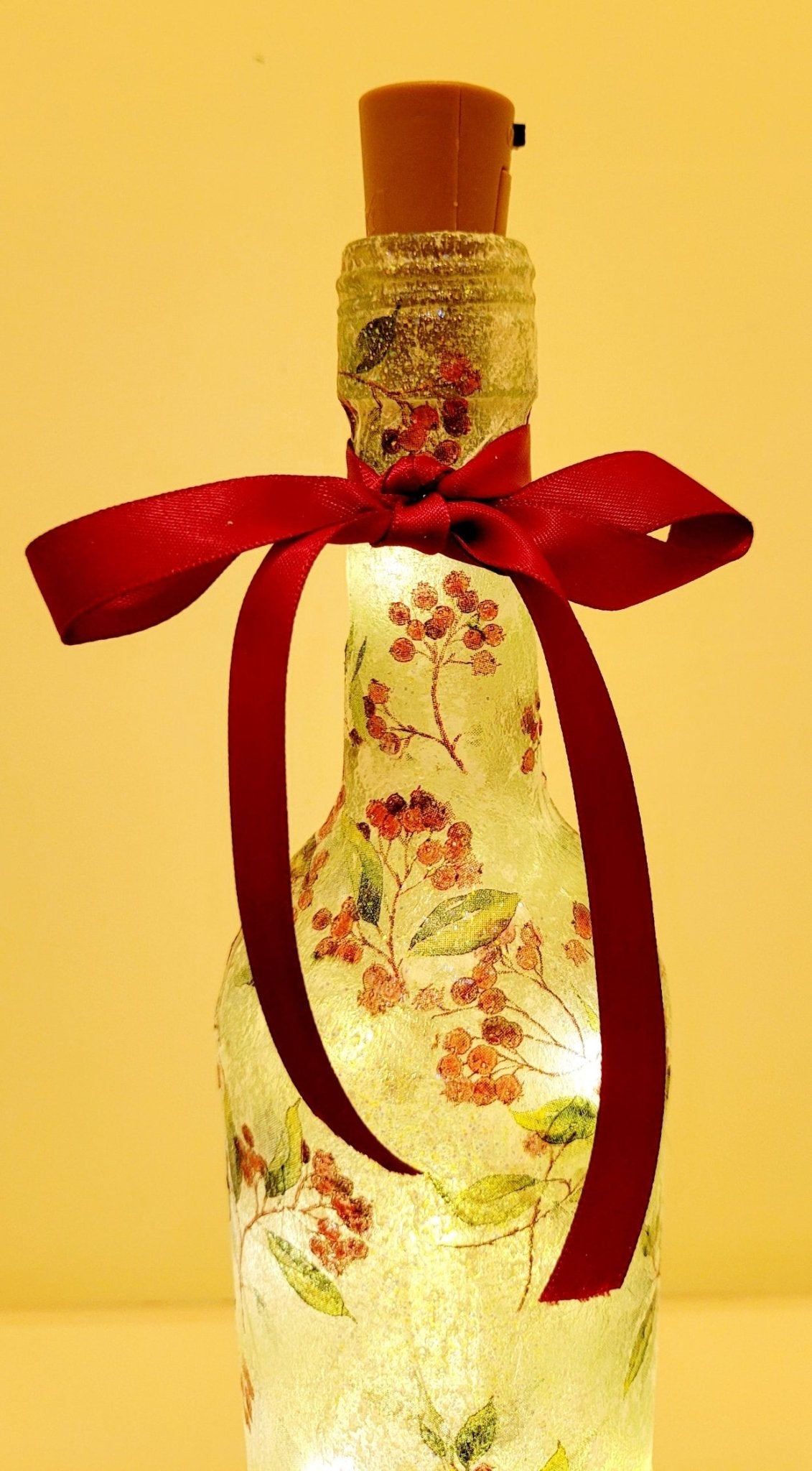 Illuminate your space with the enchanting decoupage berry leaf bottle lamp! Embrace the charm of a decoupage wine bottle adorned with attractive red berries, and leaves.