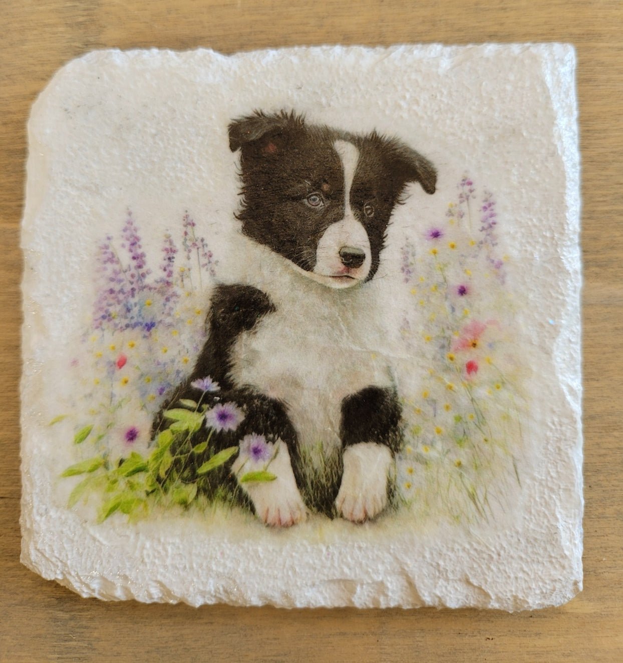 Introduce a splash of personality with our charming set of four Border Collie coasters, each boasting a unique design that captures the playful spirit of these adorable pups. Crafted from square slate, these coasters are not only cute and colourful but also incredibly practical for everyday use.