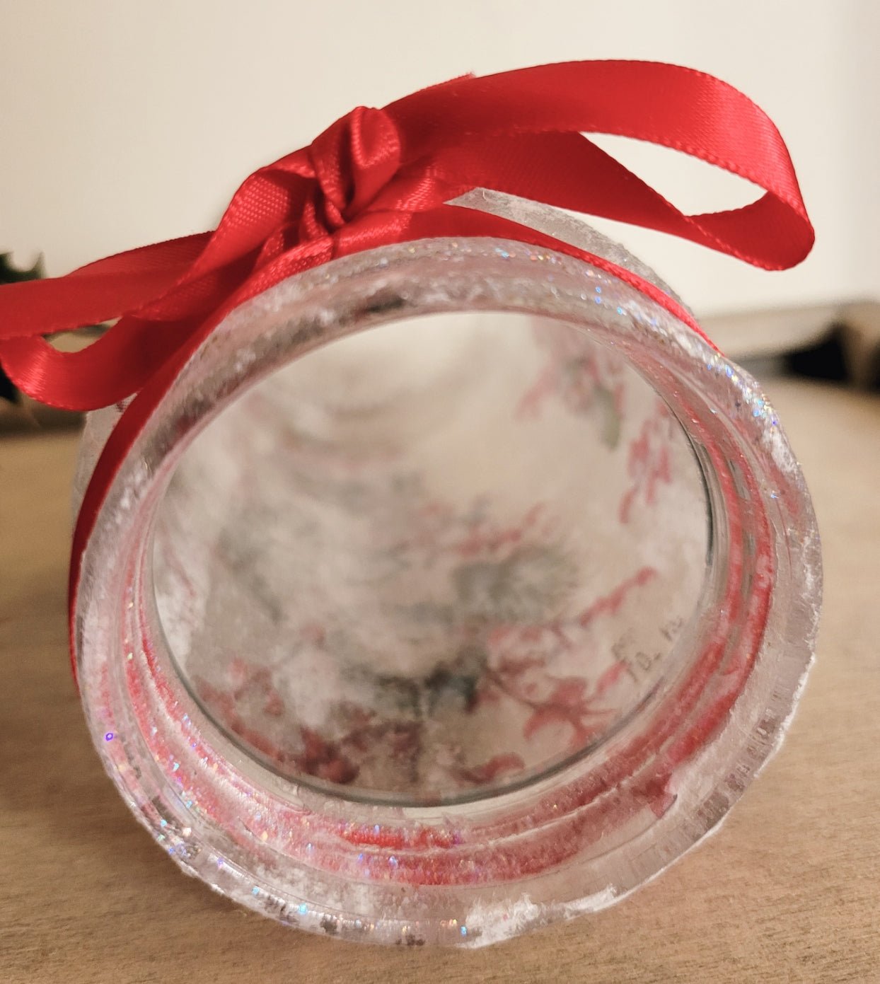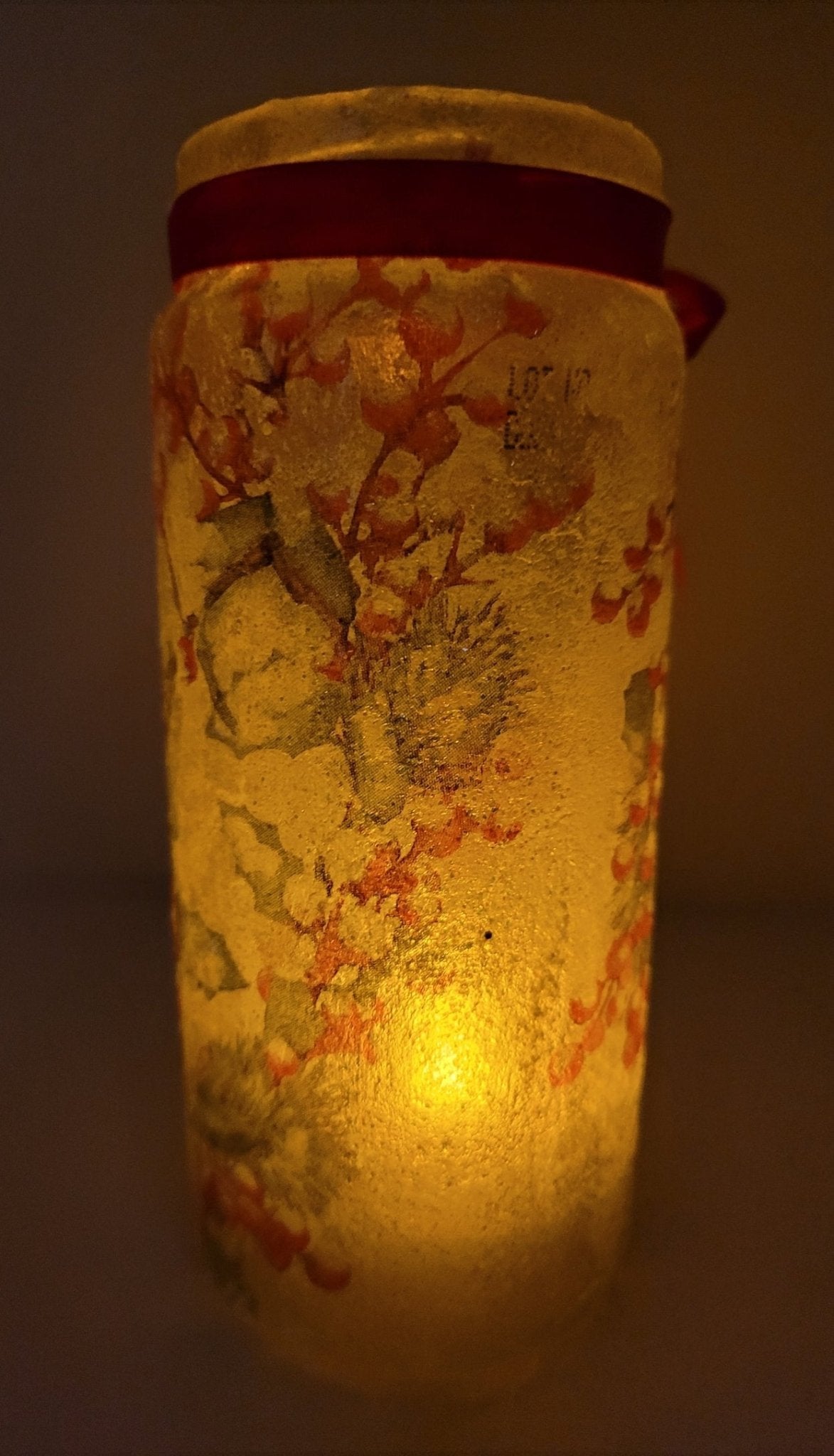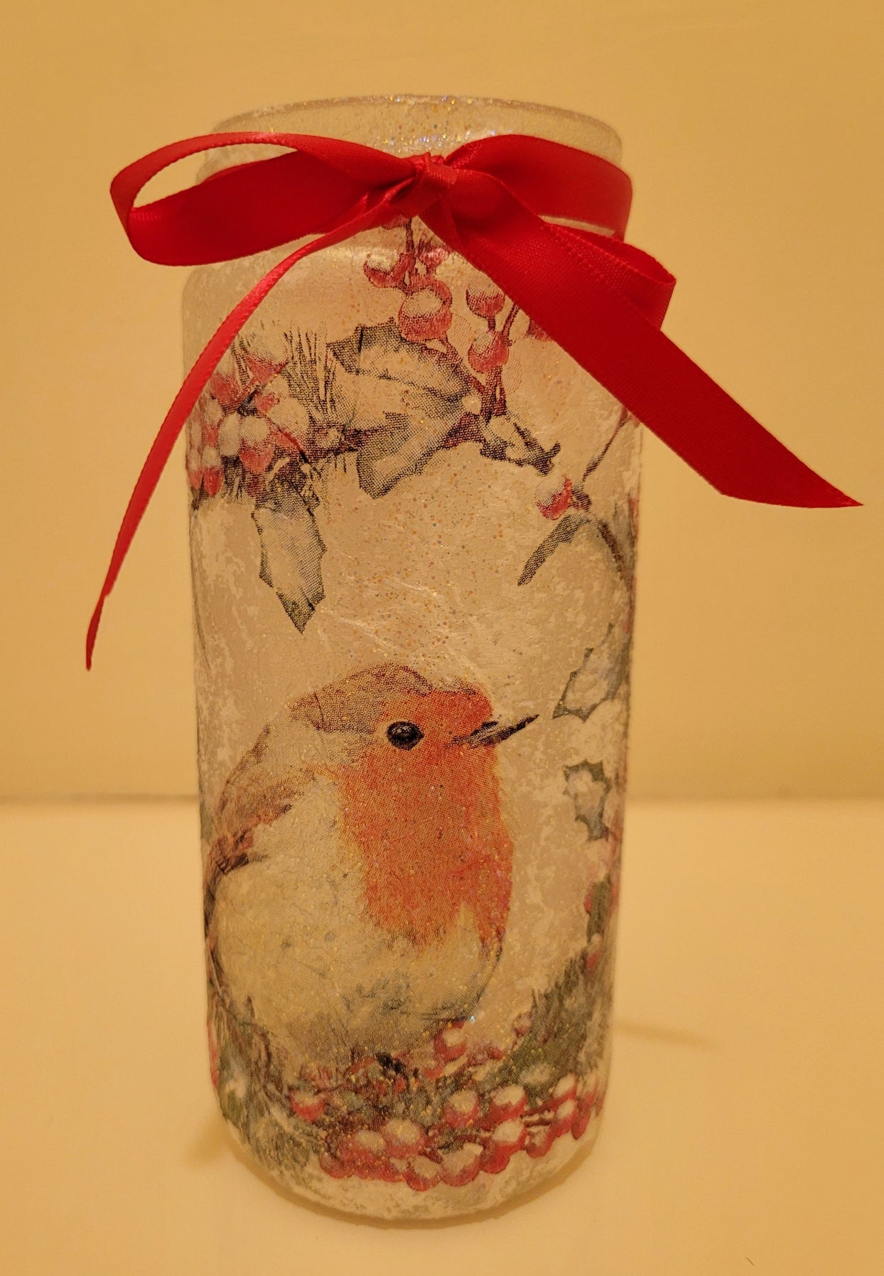 This is a simple recycled glass jar, decoupaged with a cute little Robin design and sealed with a sparkly gel medium. Finished with a decorative red ribbon, this Robin Lantern is great for bringing a little bit of nature indoors.