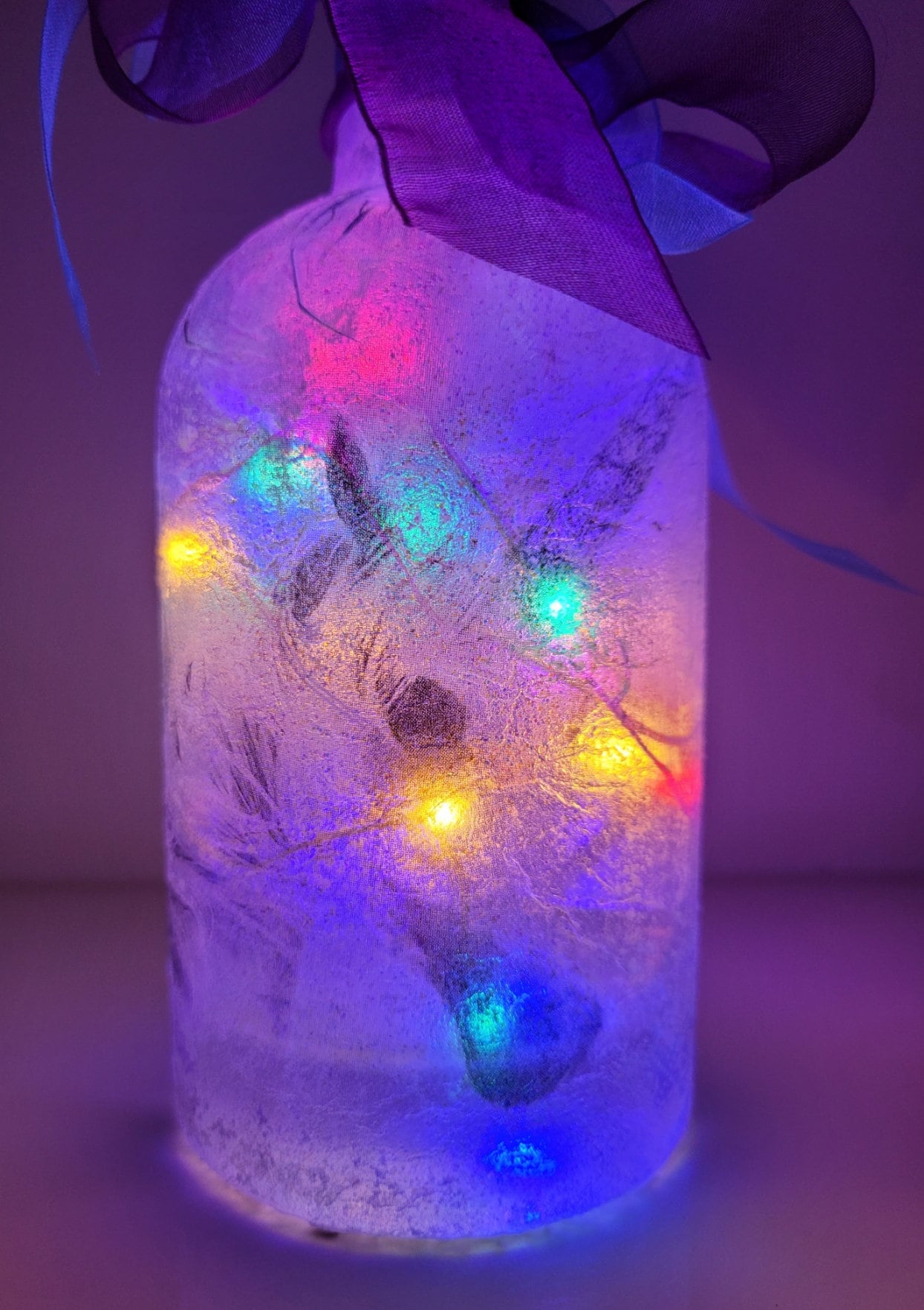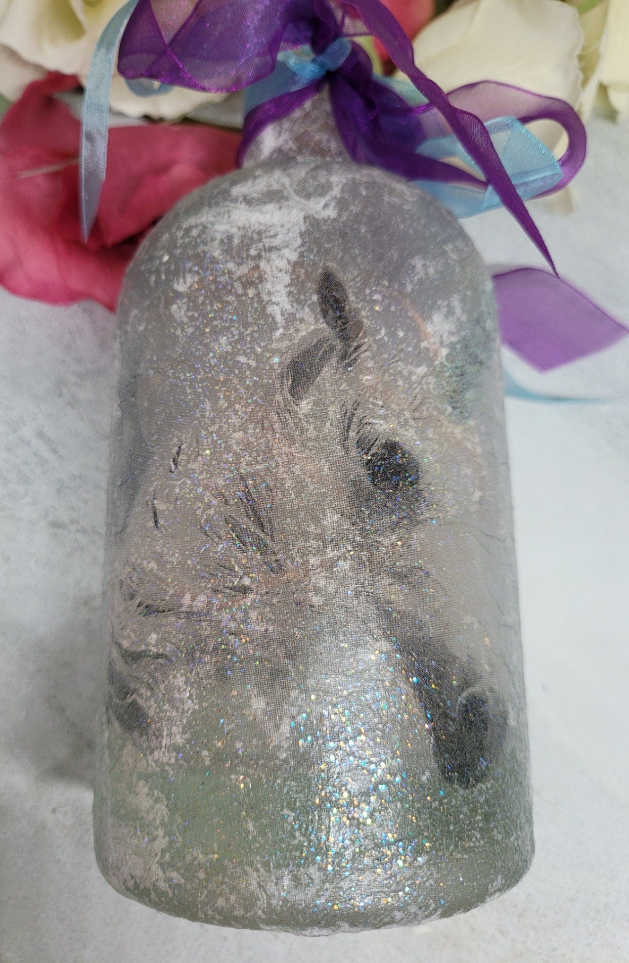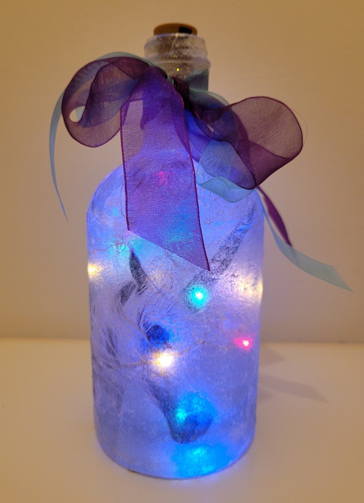 This gorgeous Unicorn 🦄 light up lamp is perfect for any little girl's bedroom. She will be enchanted by the magical Unicorn print encircling the whole bottle, with a rainbow coloured 🌈 organza ribbon around the neck. The multi-coloured cork LED lights inside give off a soft glow that will bring a touch of magic to her room and make her feel calm and safe when she goes to sleep.