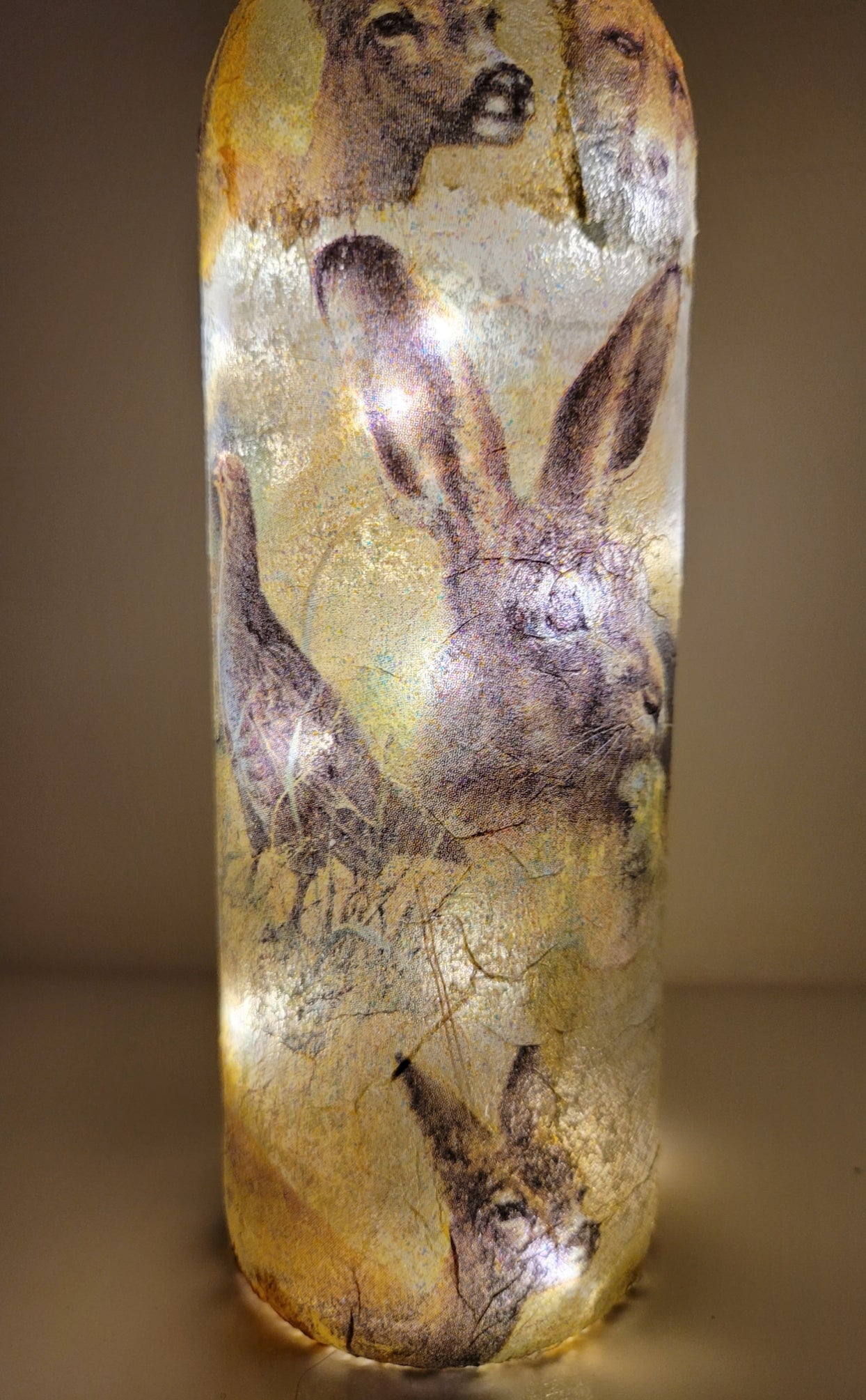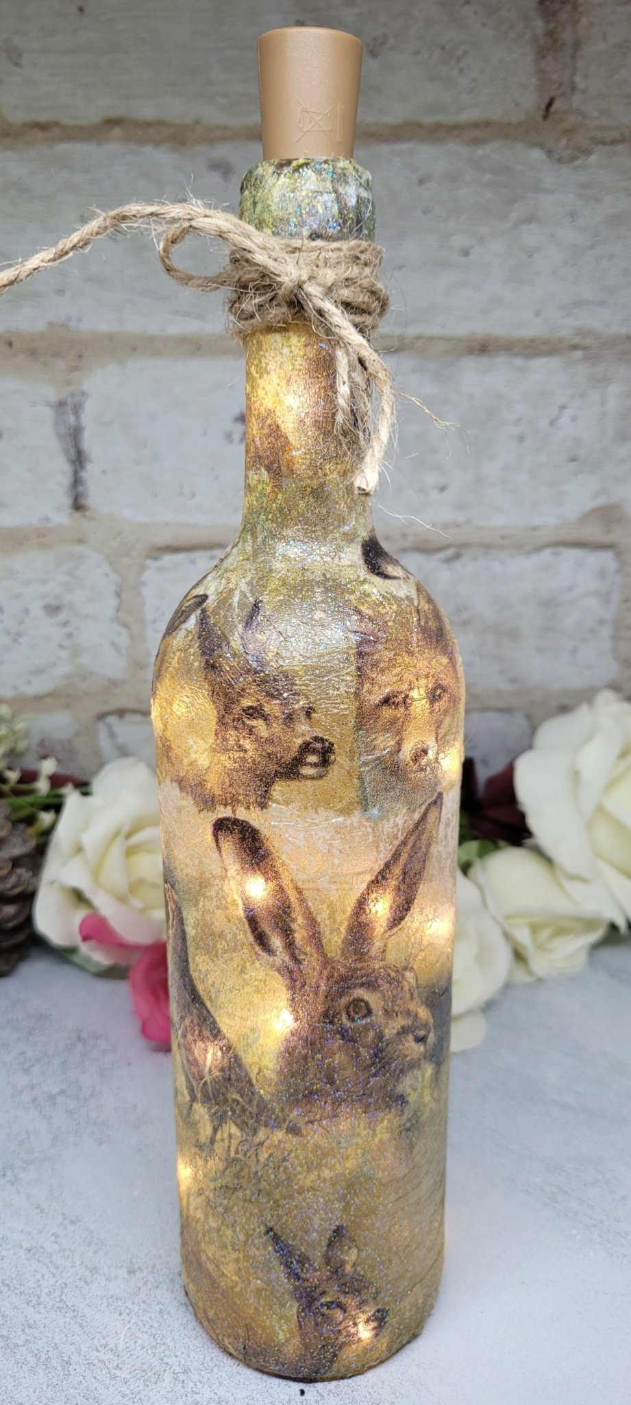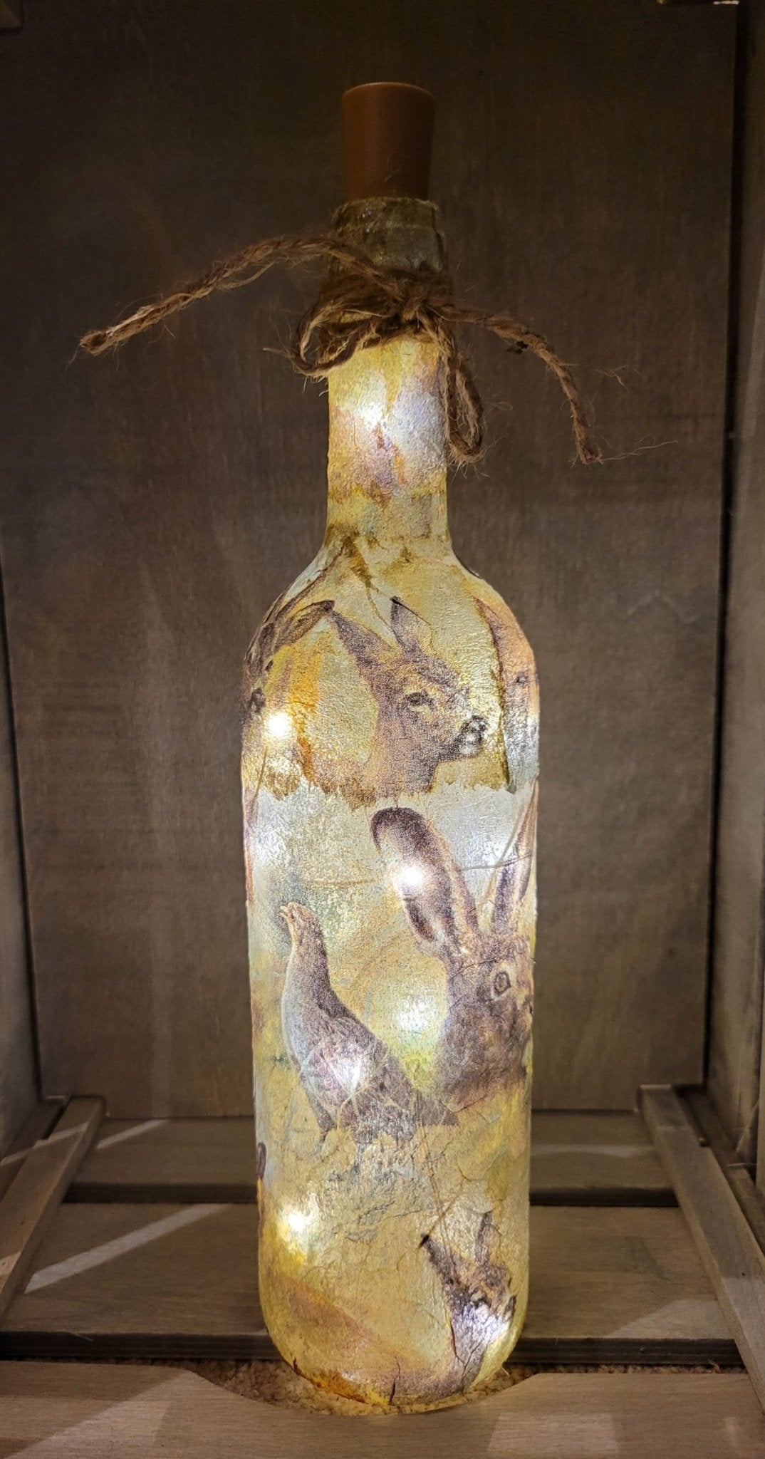 I think of the glass bottle lamp as a piece of art, with the wildlife design that features an adorable illustration of Hares 🐰 Foxes 🦊 Birds 🐦and Deer 🦌The bottle is finished with a rustic string bow.