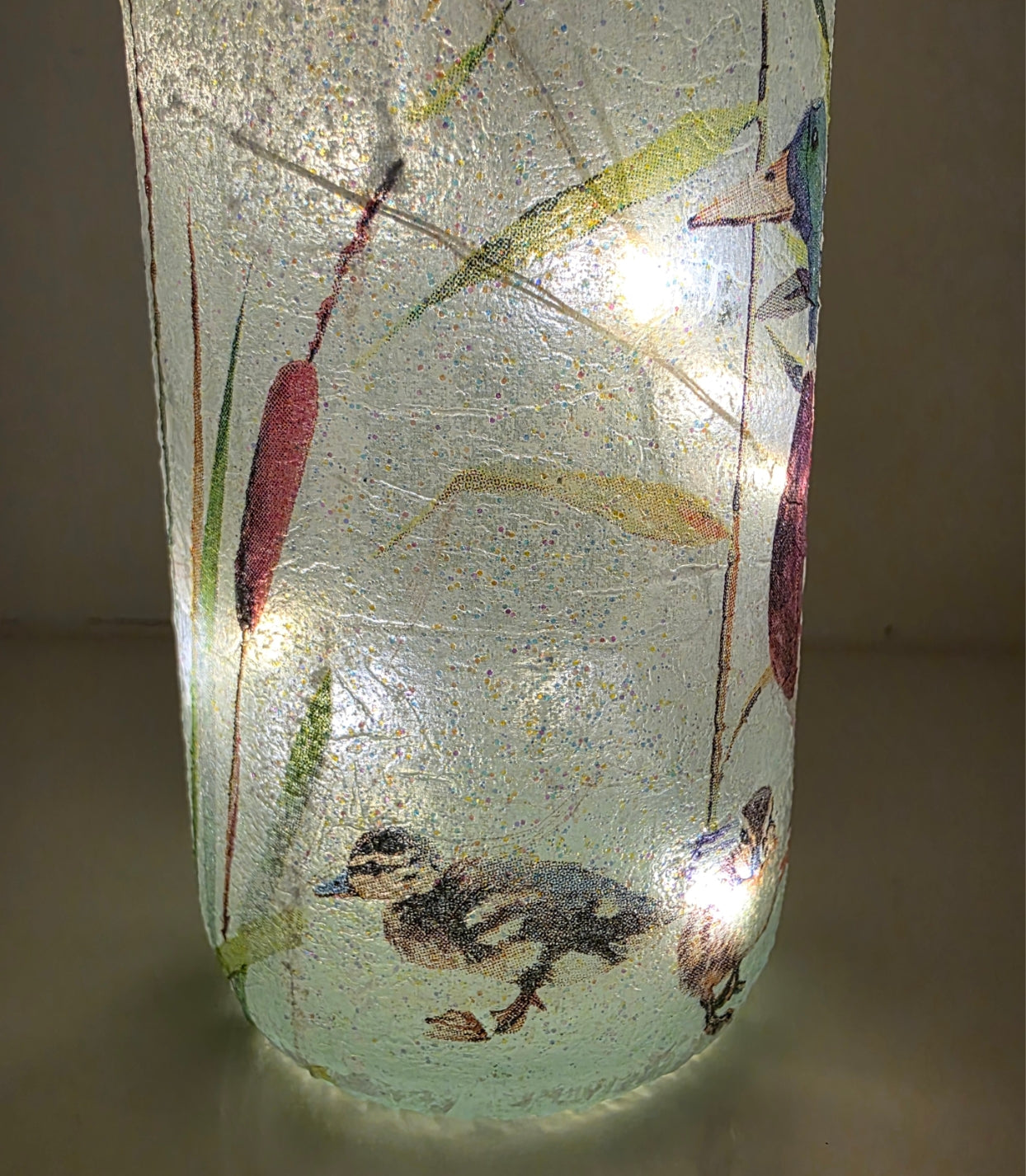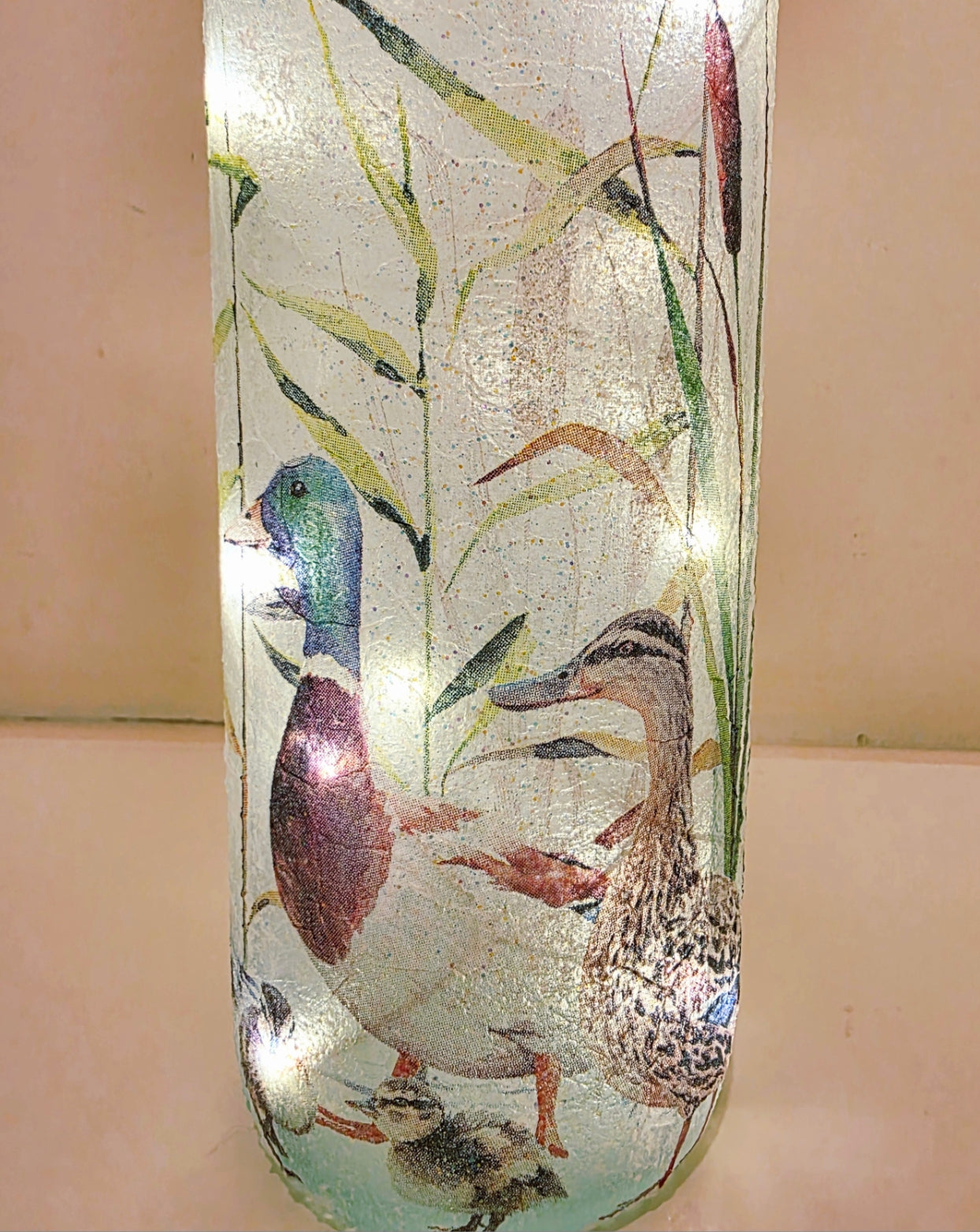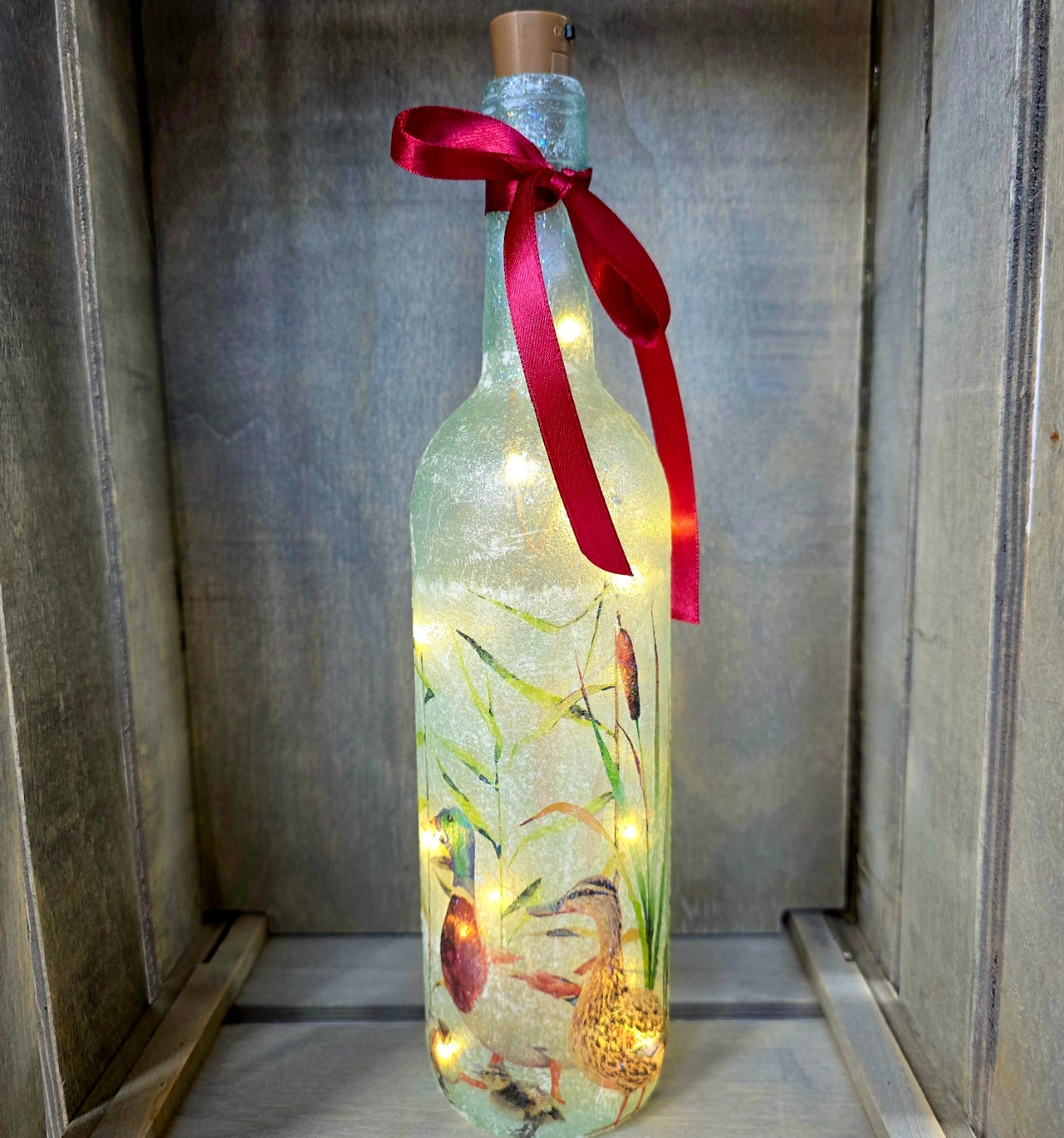 It’s a new arrival for summer 2025!! Our hand crafted Ducks and Ducklings Bottle Lamp, is a delightful addition that brings the charm of nature into your home. This adorable decoupage bottle, beautifully adorned with a cute Ducks and their cute ducklings napkin, serves not just as a lamp but as a piece of art that exudes warmth and cheer. Imagine the soft glow illuminating your room, creating a serene atmosphere perfect for winding down after a long day. Whether you're looking to enhance your living space, gift a friend, or simply enjoy the charm of Ducks and Ducklings, this wine bottle lamp is the ideal choice.