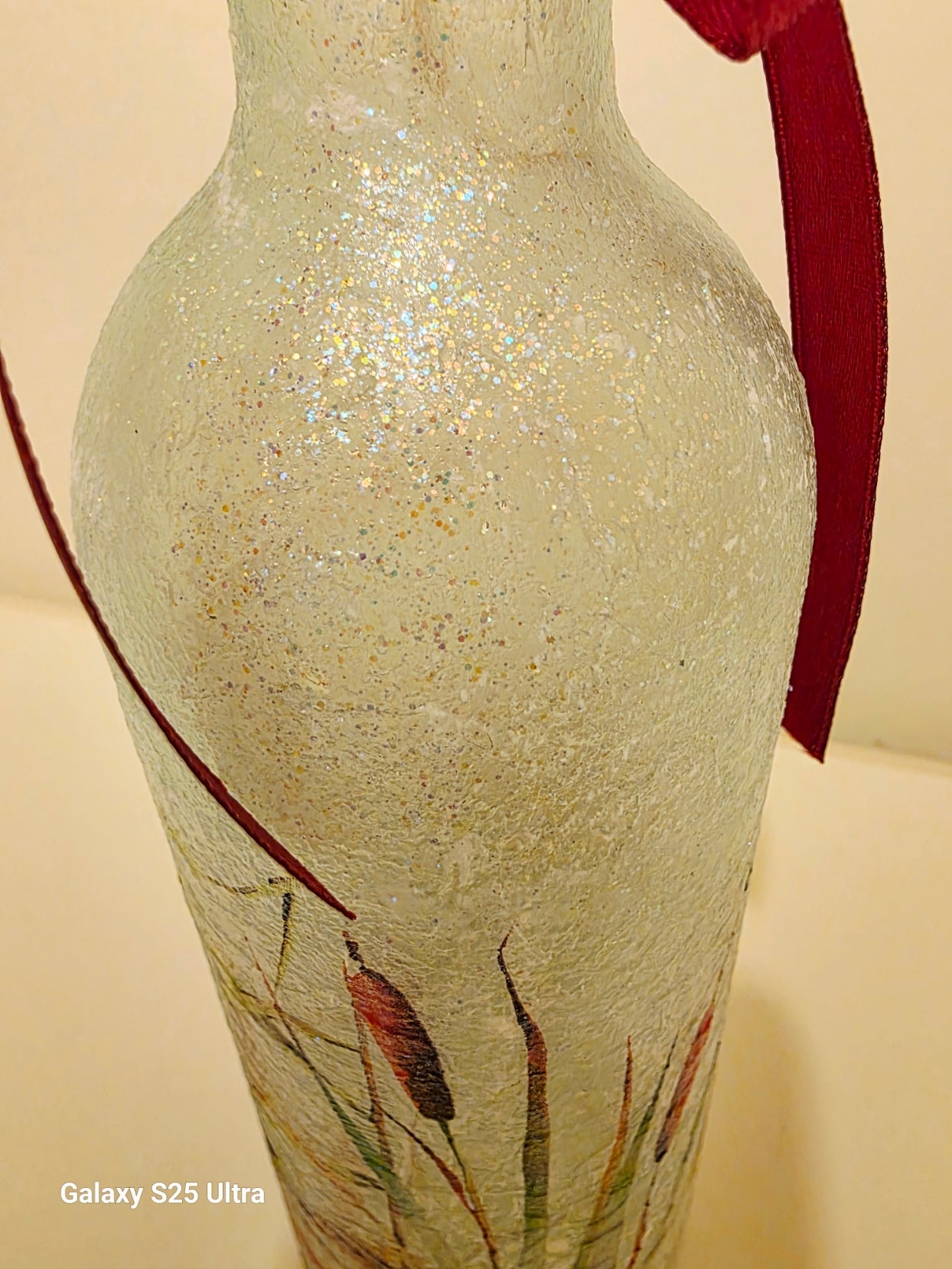 Sparkly finish and red ribbon embellishment.
