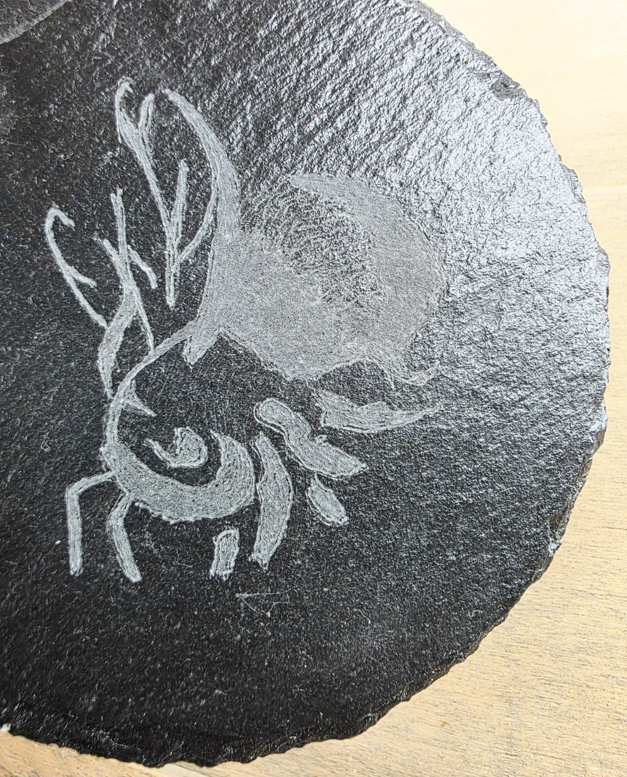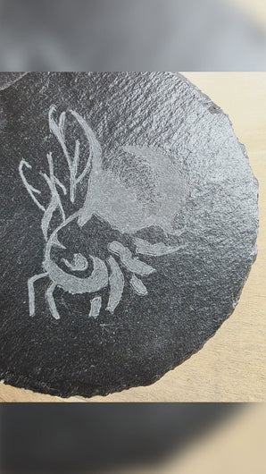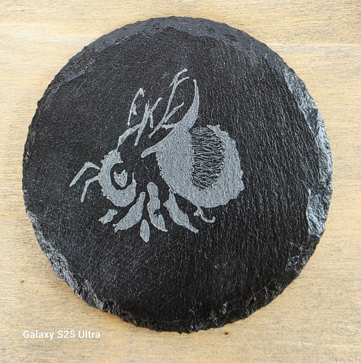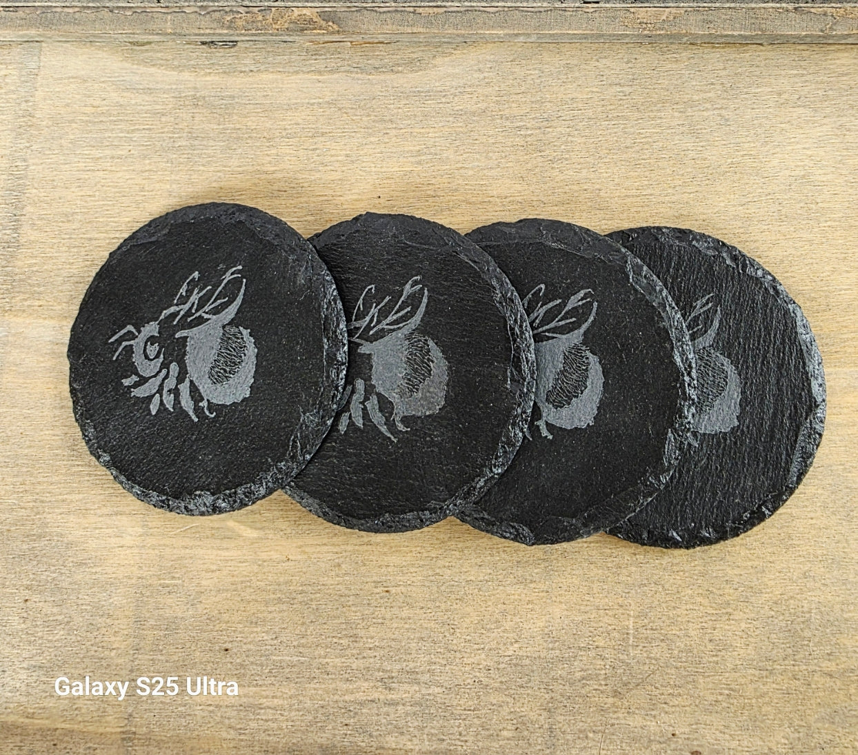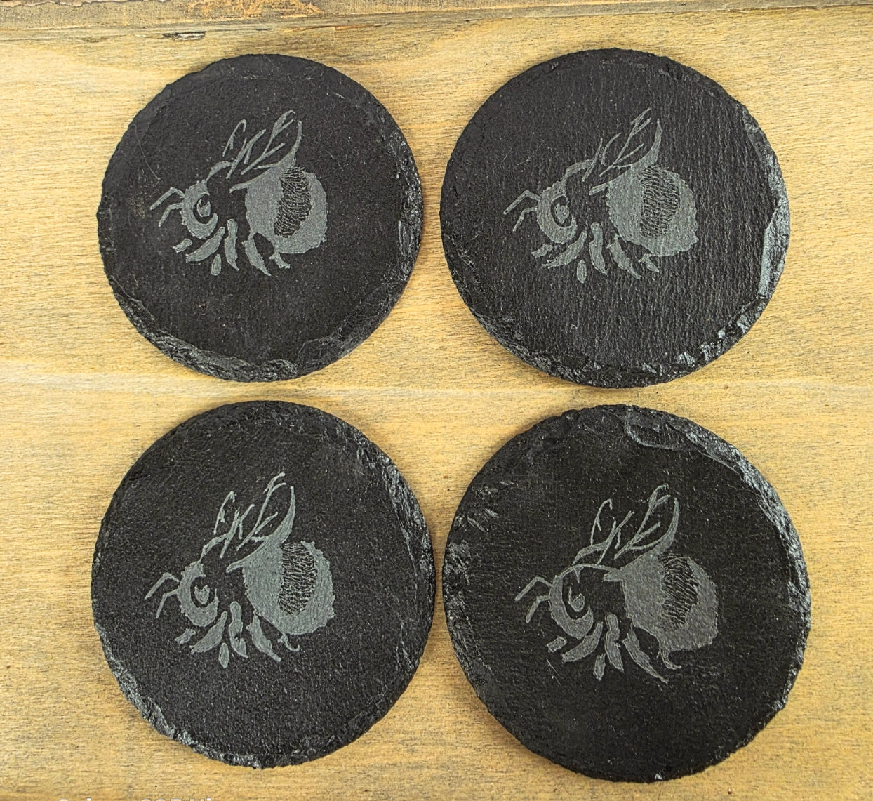 Our exquisite engraved bumble ee Slate Coasters are a delightful set of four round black slate coasters that effortlessly combine practicality with charm.