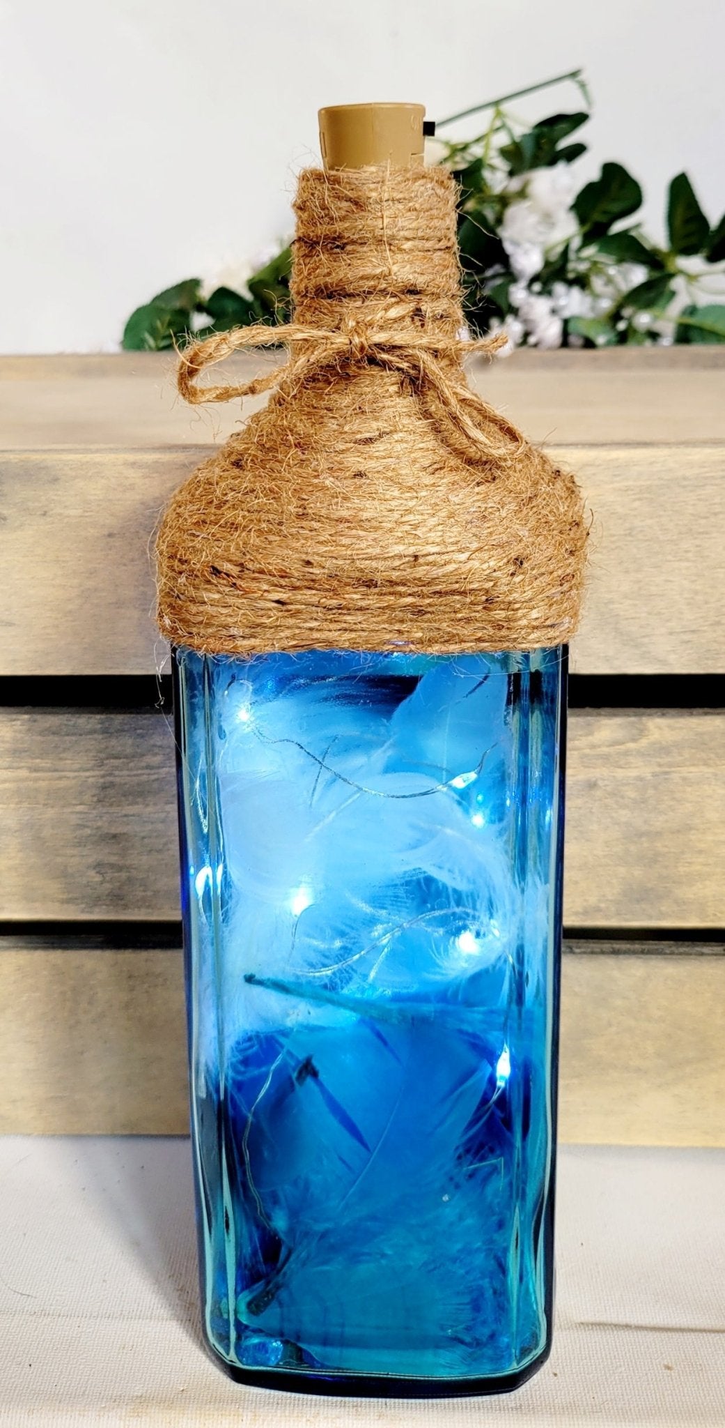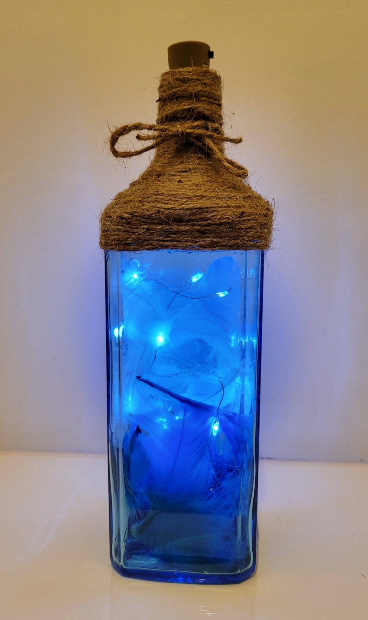 Illuminate your space with a touch of elegance with this feather filled Gin bottle lamp. This unique lamp is a stunning blue square gin bottle filled with a mesmerising combination of blue and white feathers, creating a truly captivating visual effect.