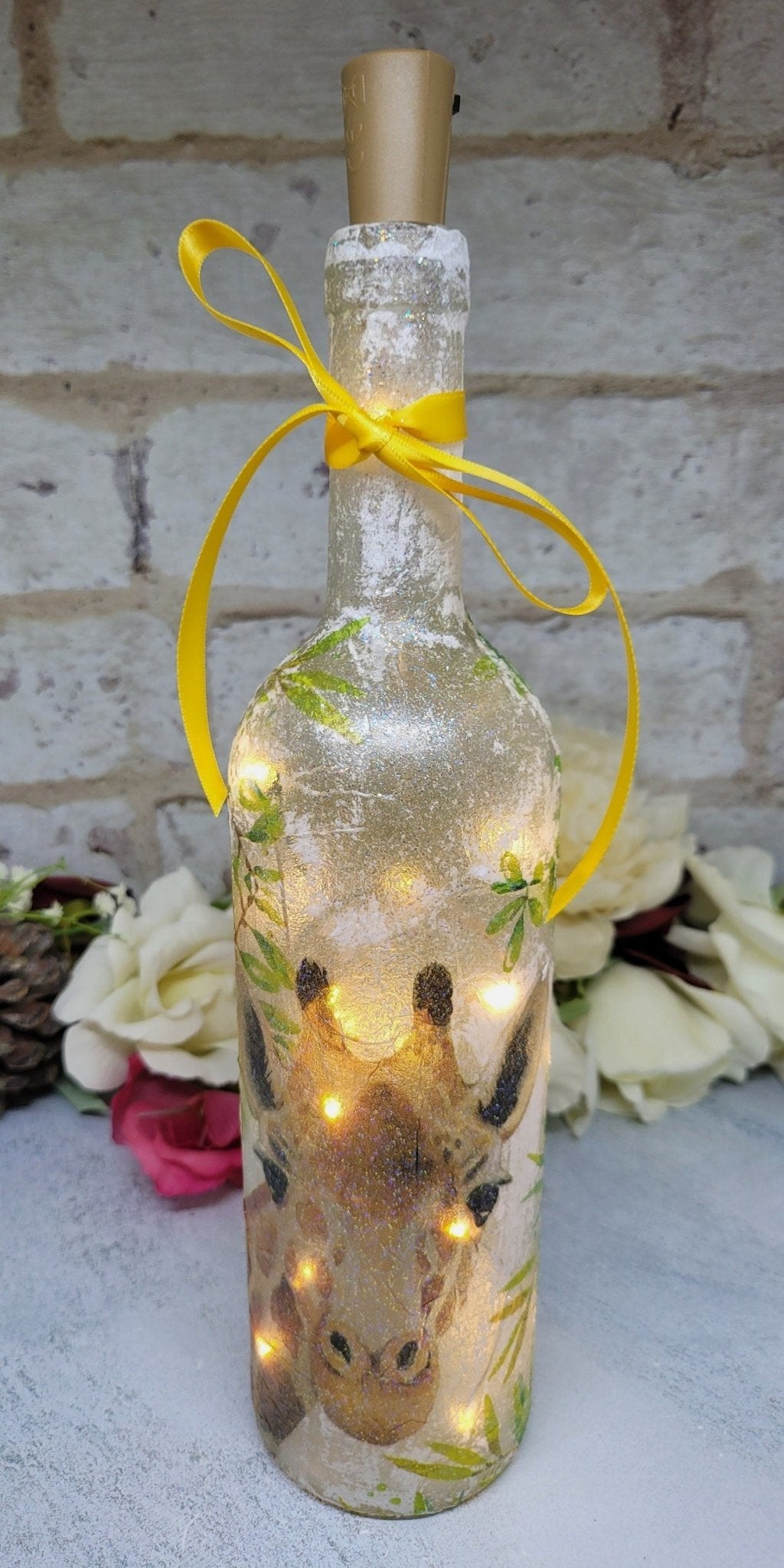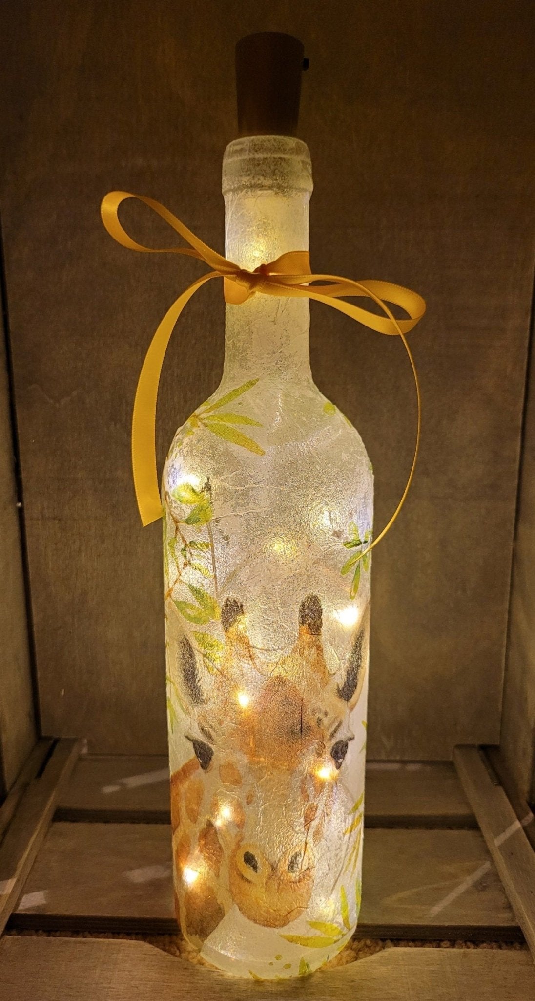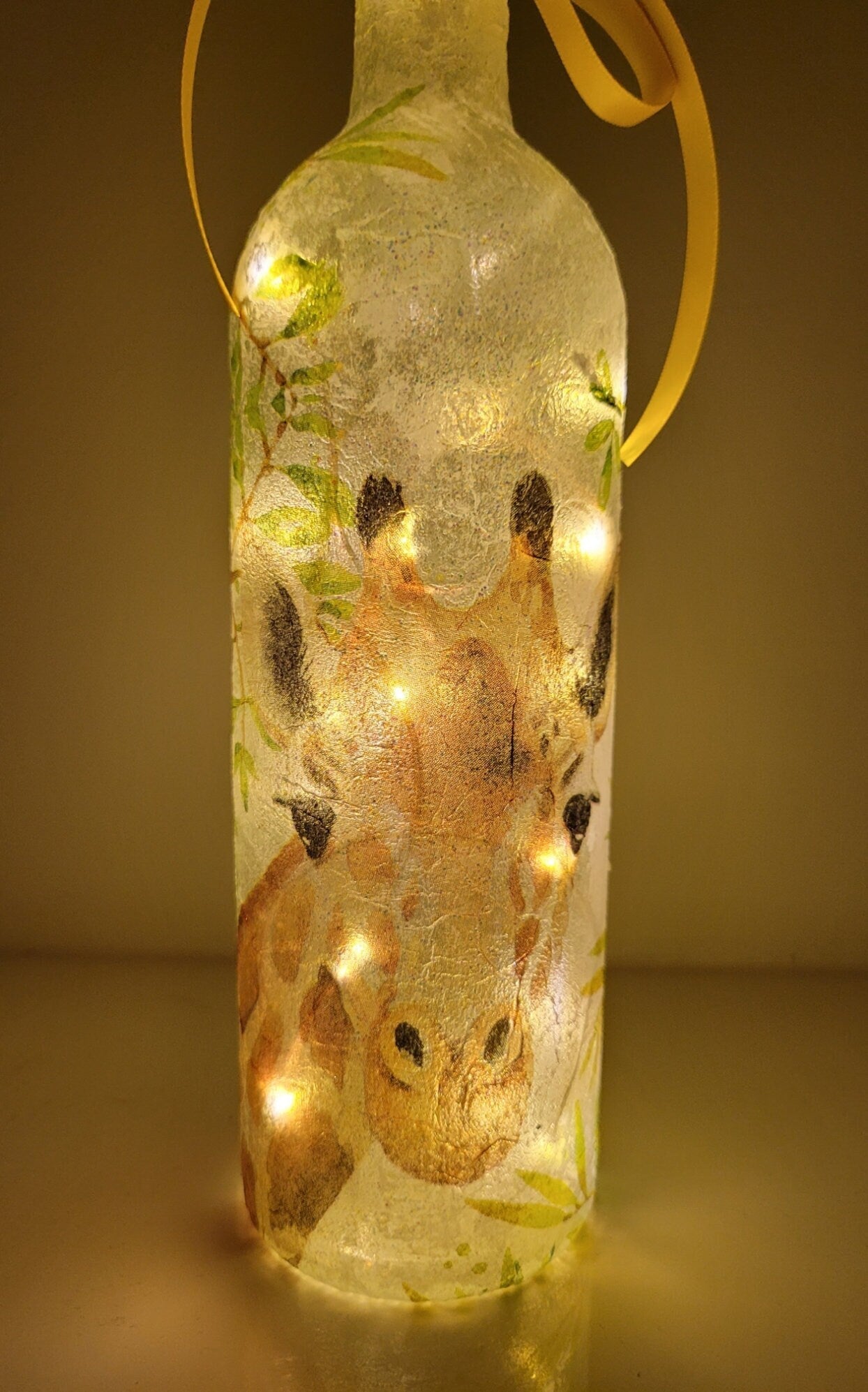 My light up Giraffe 🦒 bottle lamp comes designed on a standard glass wine bottle. The gorgeous Giraffe decoupage design surrounds the whole bottle, and a yellow ribbon sits around the neck.