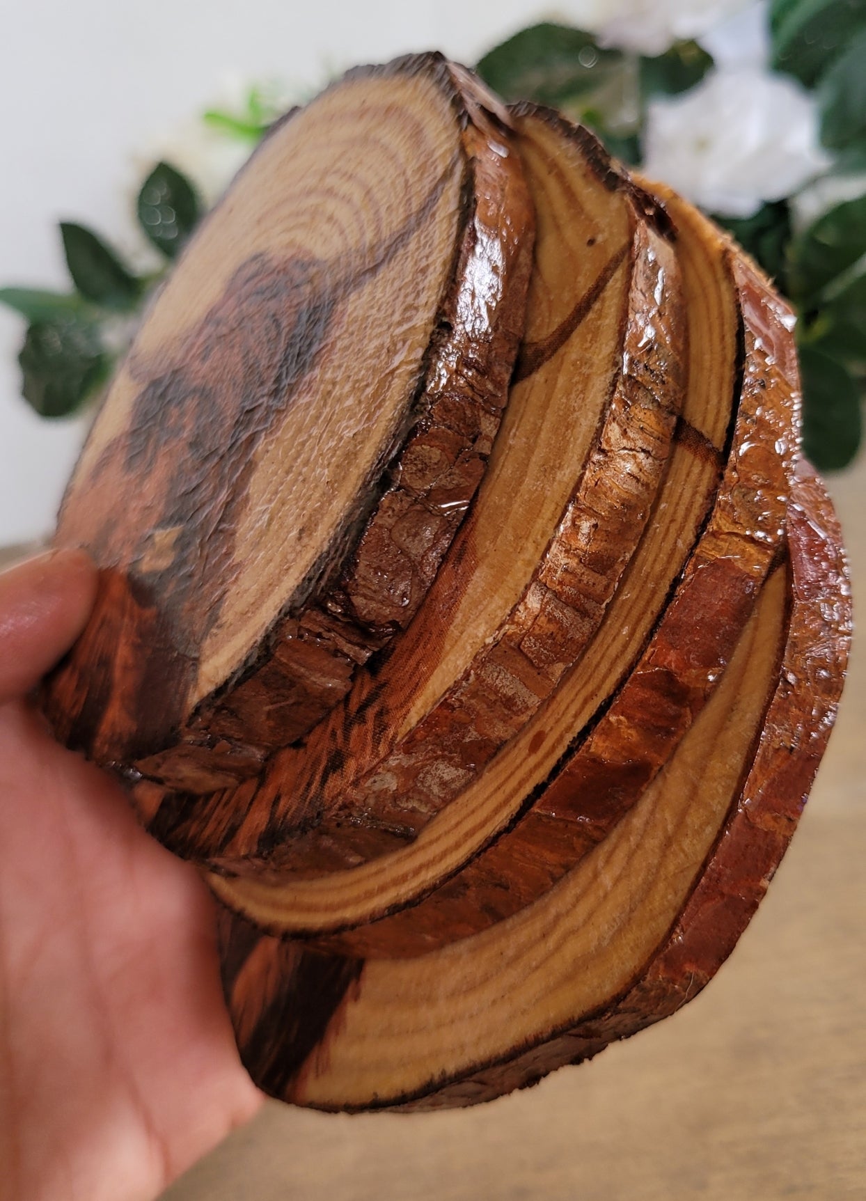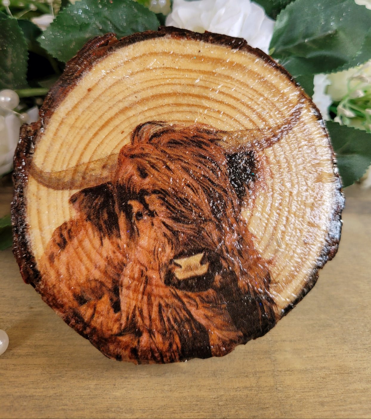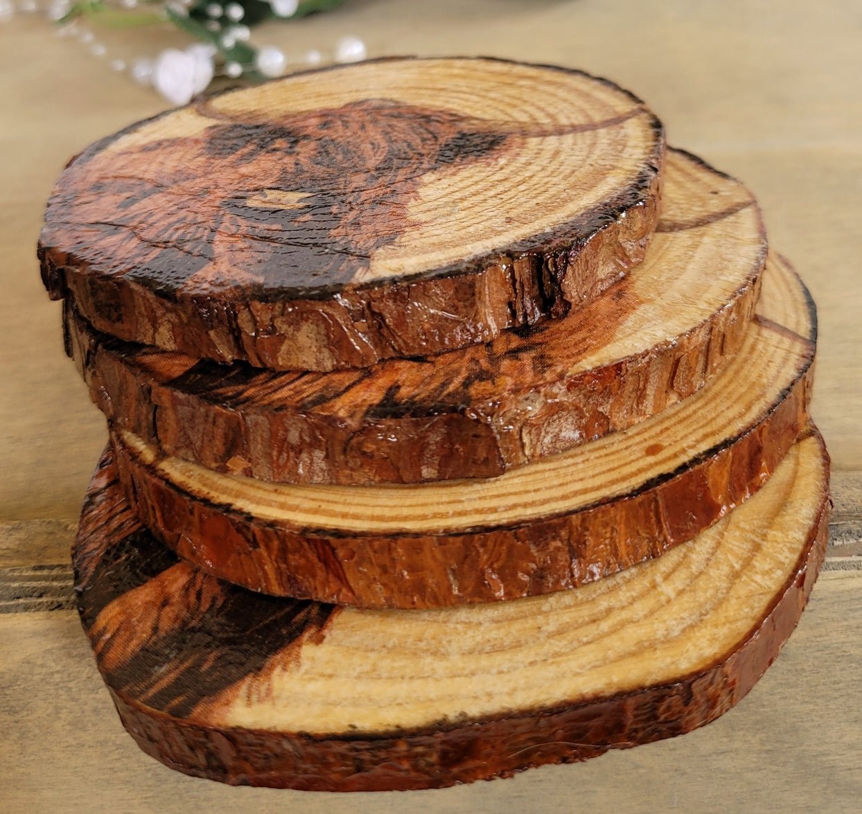 Once you see these, you'll want them all over the place! These unique, rustic wooden coaster sets make a wonderful gift and will look great on any table top. Each is decoupaged, using a paper napkin and gel medium with a beautiful Highland cow design, leaving the bark left on so you get a really authentic look. The reverse side is left plain. They are varnished with an interior varnish first and then varnished again with a gloss yacht varnish to give them protection.