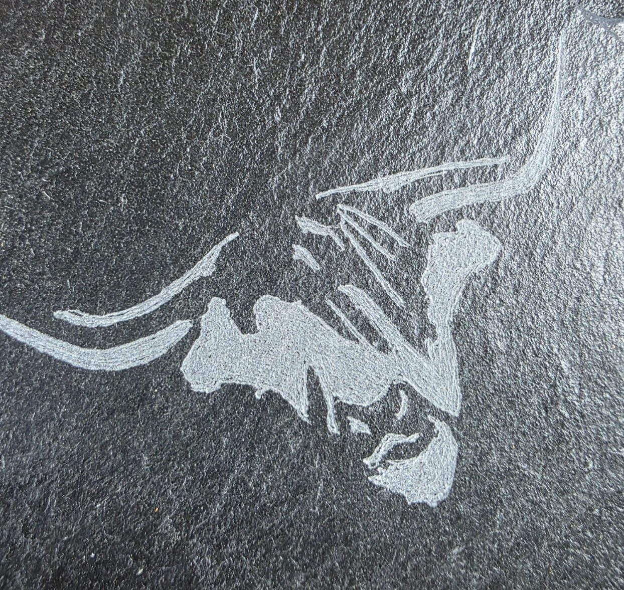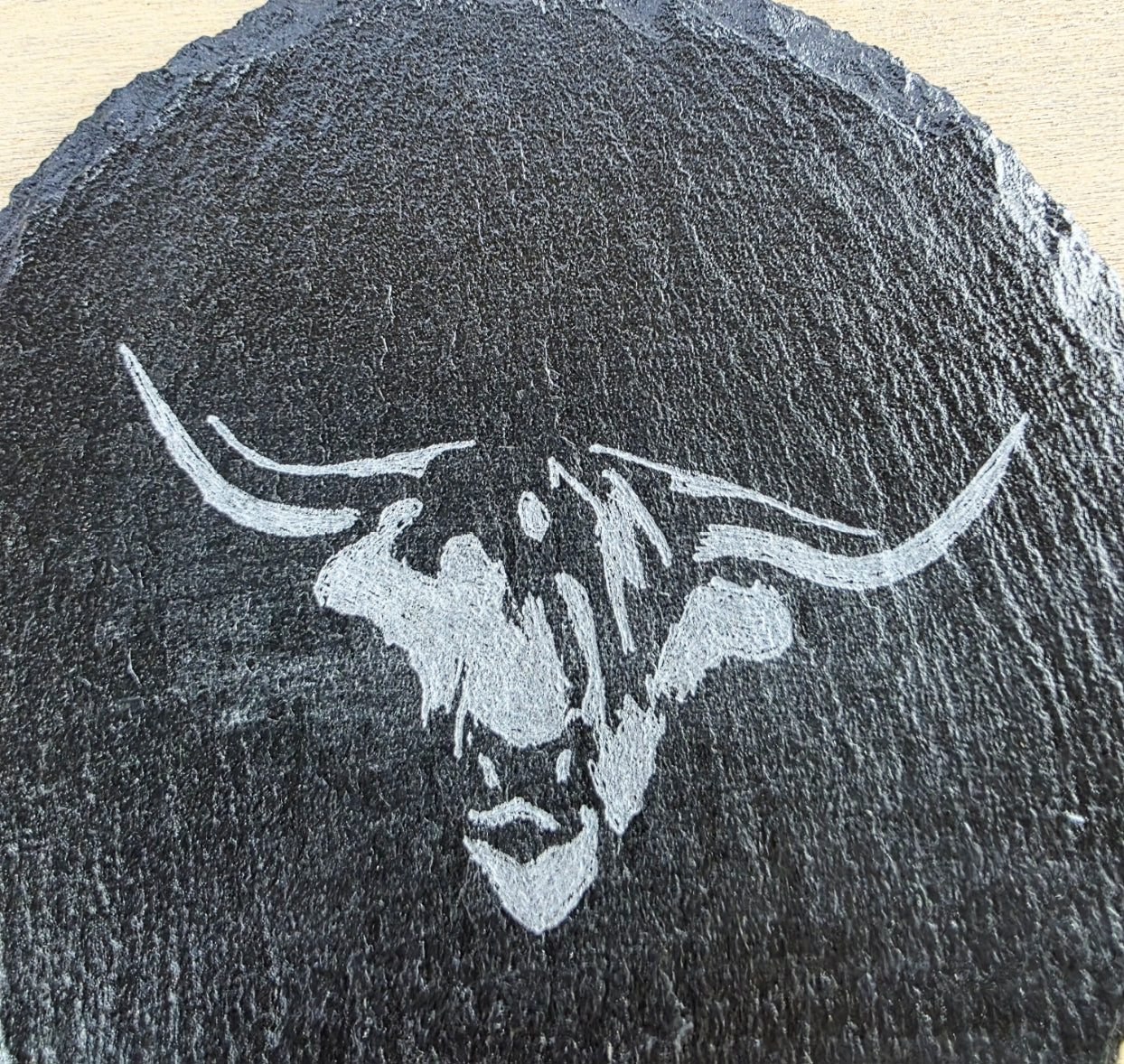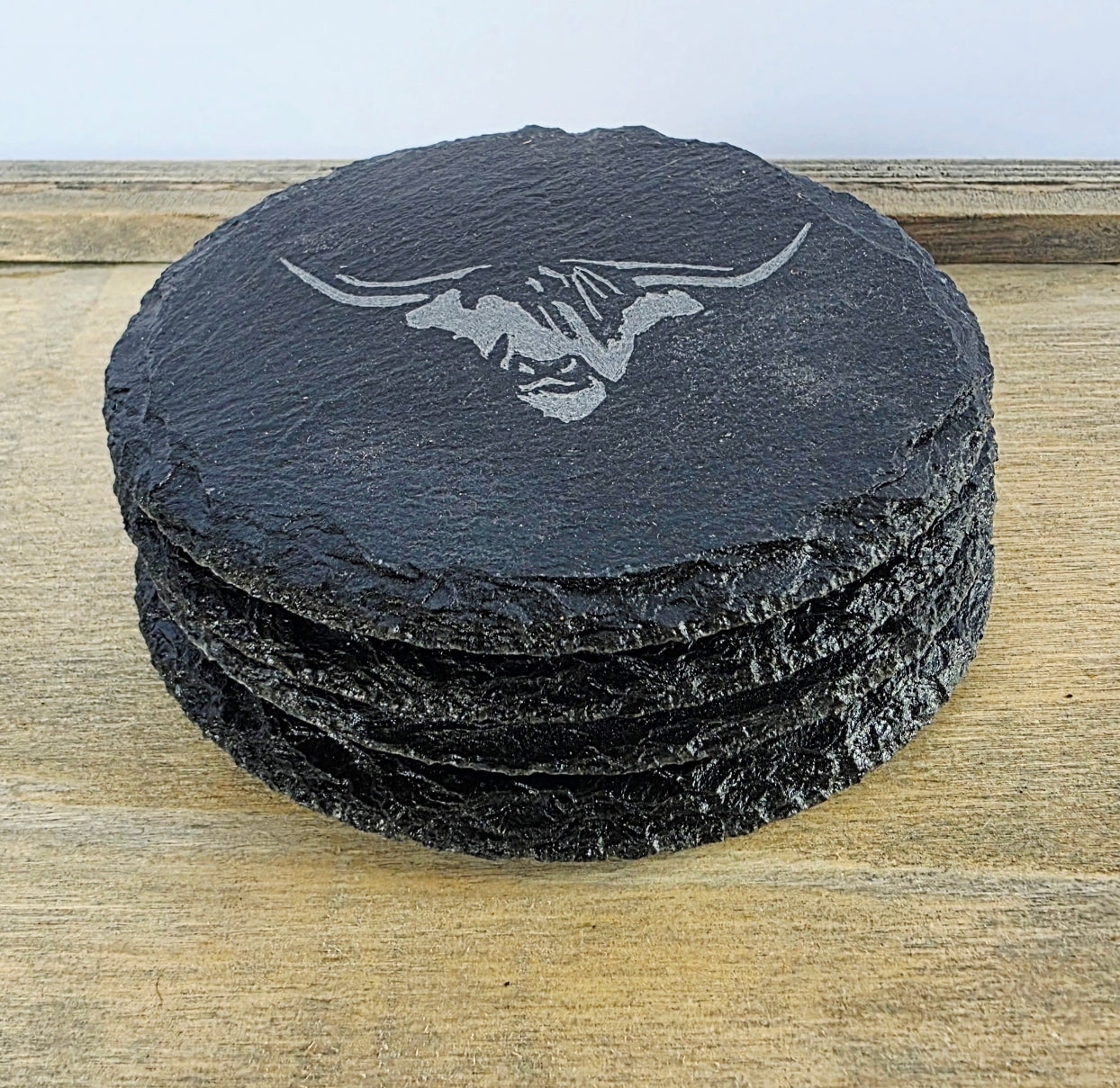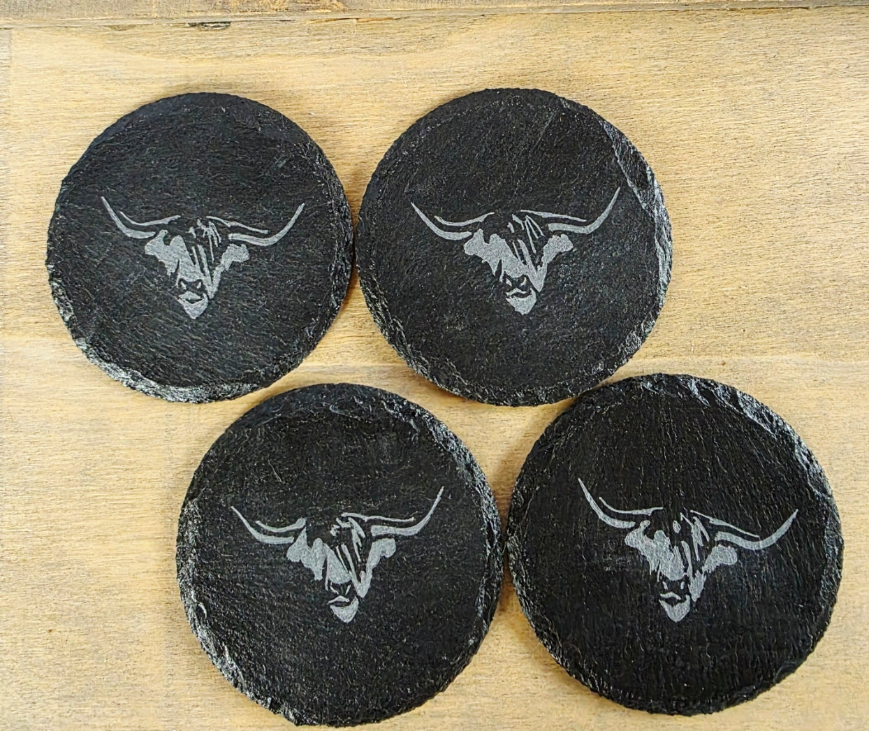 Bring rustic charm to your home with this set of four hand-engraved Highland Cow slate coasters.