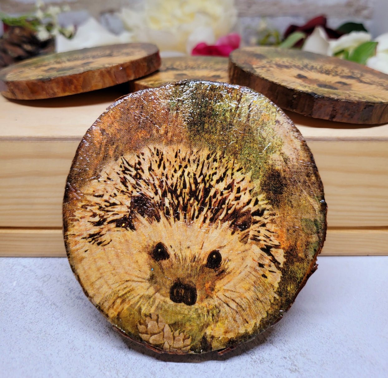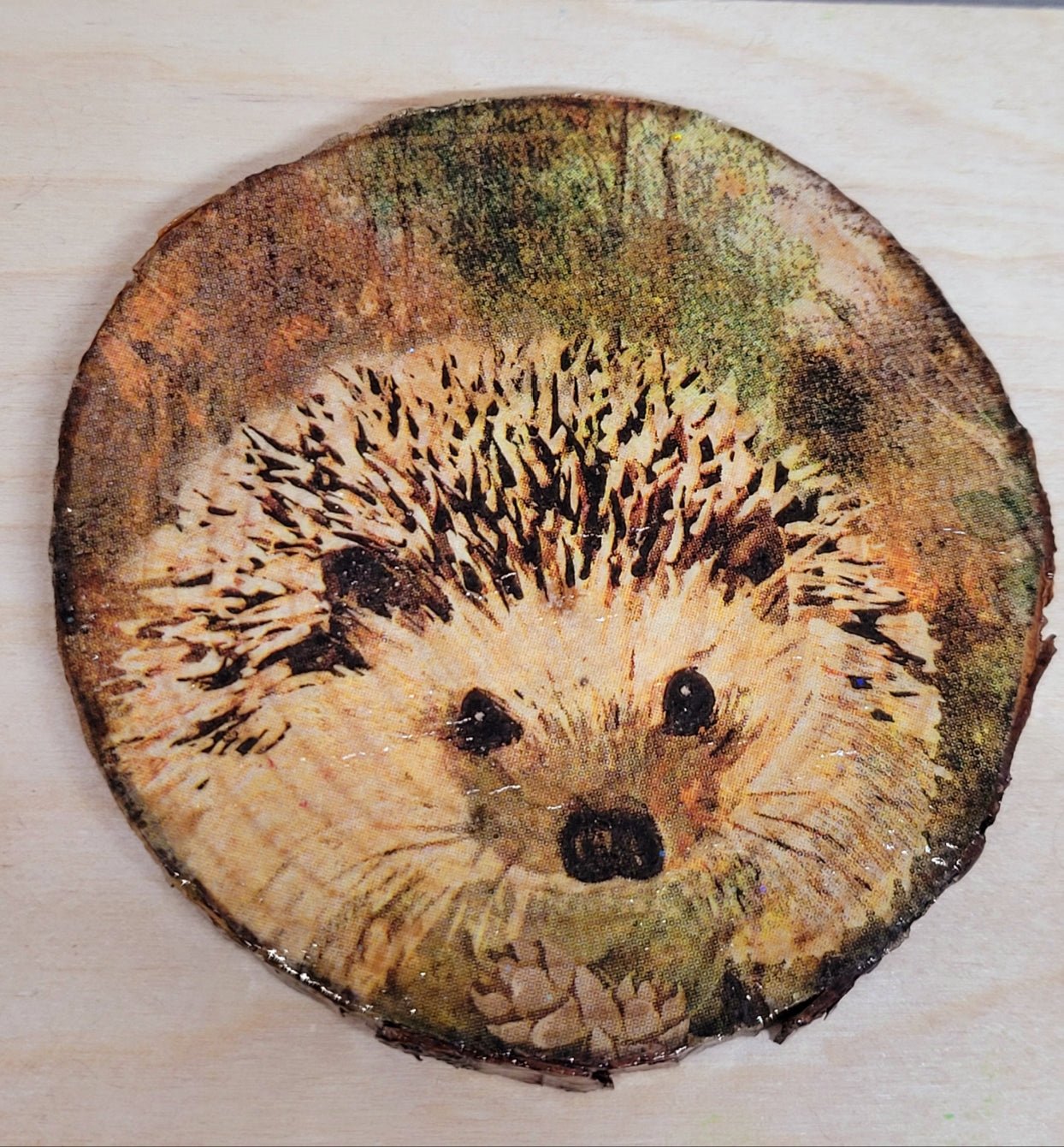 They are decoupaged with images of a Hedgehog using paper napkins and a water based sealer. The bark is left on the coasters for edging effect.