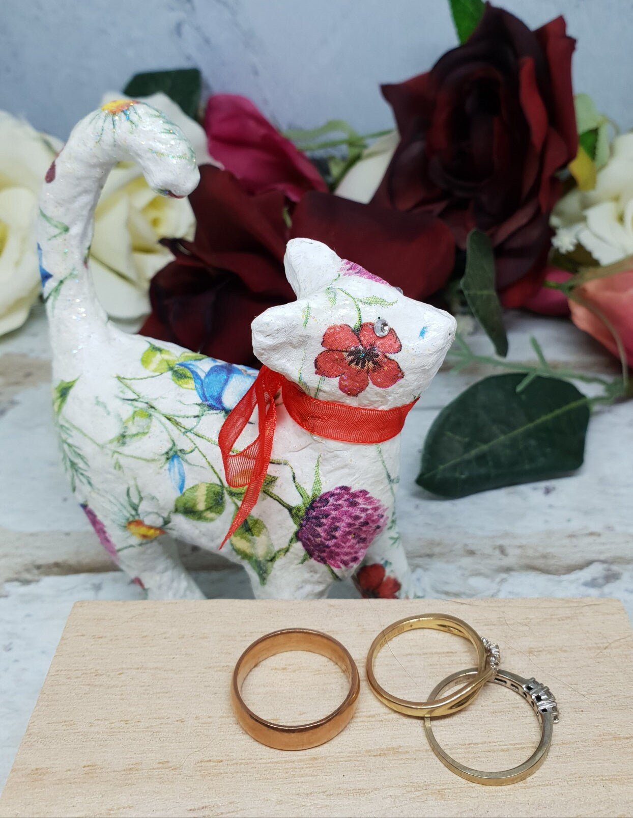 Tilly Cat is covered with a beautiful floral design and a sparkly finish. She will hold many rings, measures 4.5 inches in height x 3.5 inches length. She has sparkly eyes and is finished with a red organza bow.