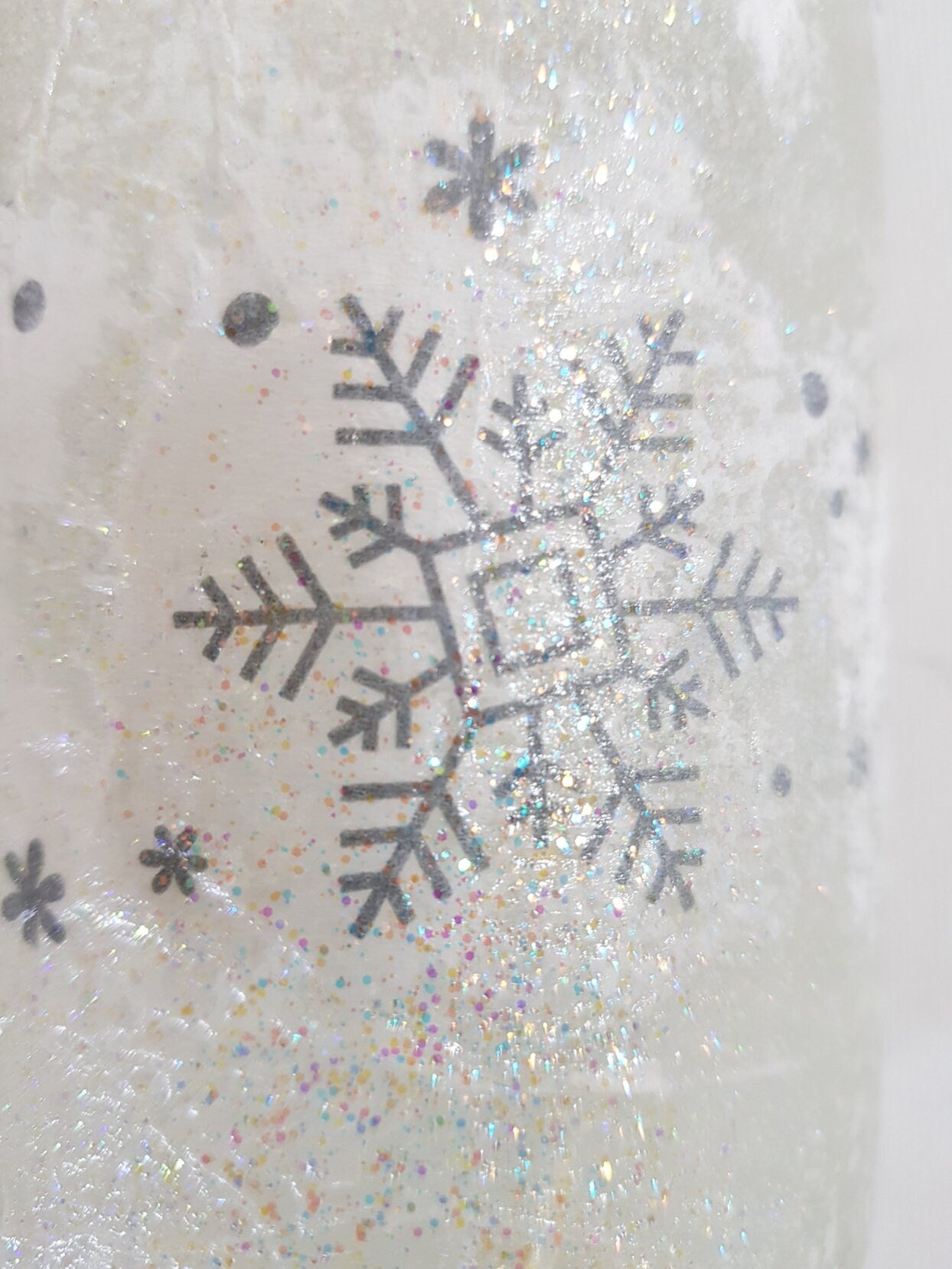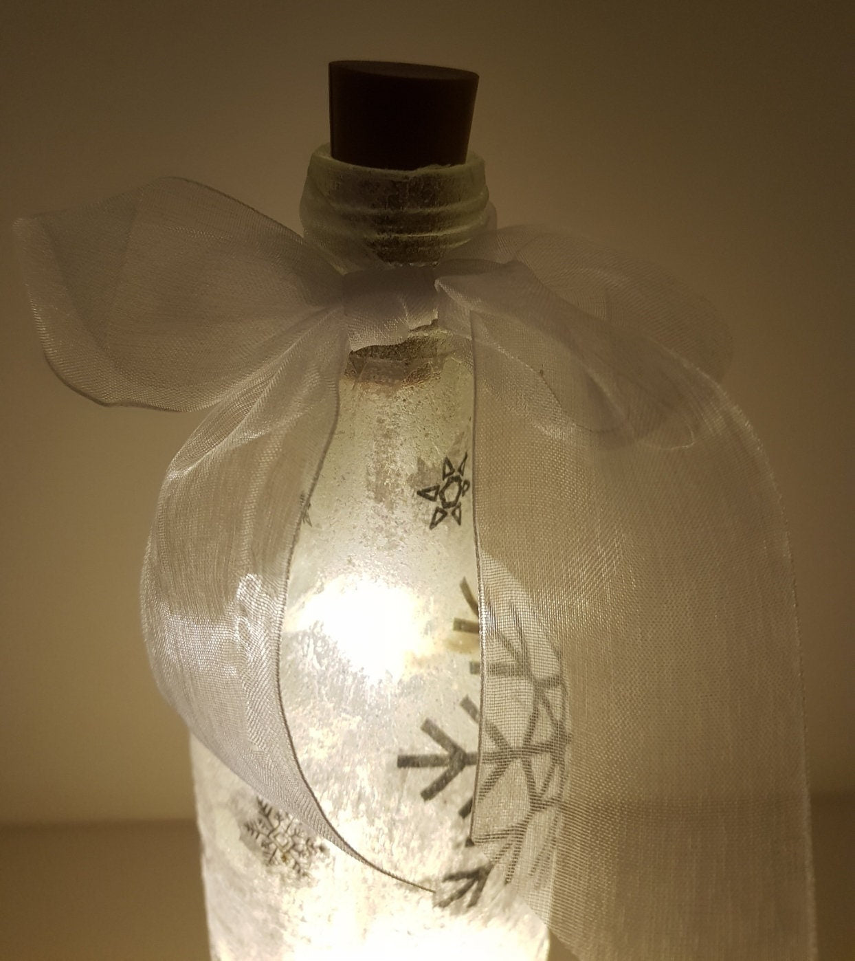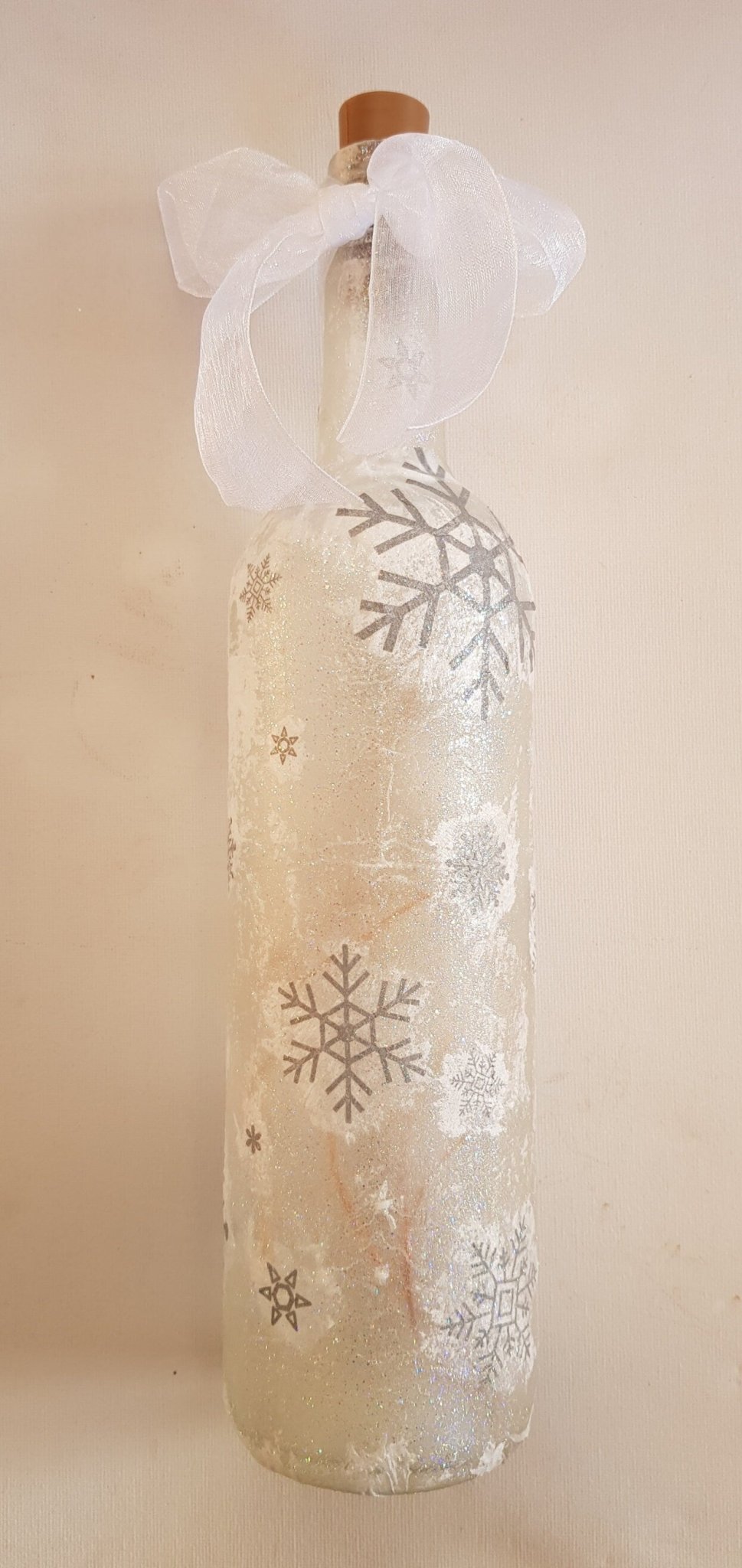 * This recycled wine bottle has been decoupaged with snowflake ❄️ napkins to create a beautiful light feature. It is finished with a sparkly gel medium to give it a beautiful frosty look, especially at Christmas! 🎄