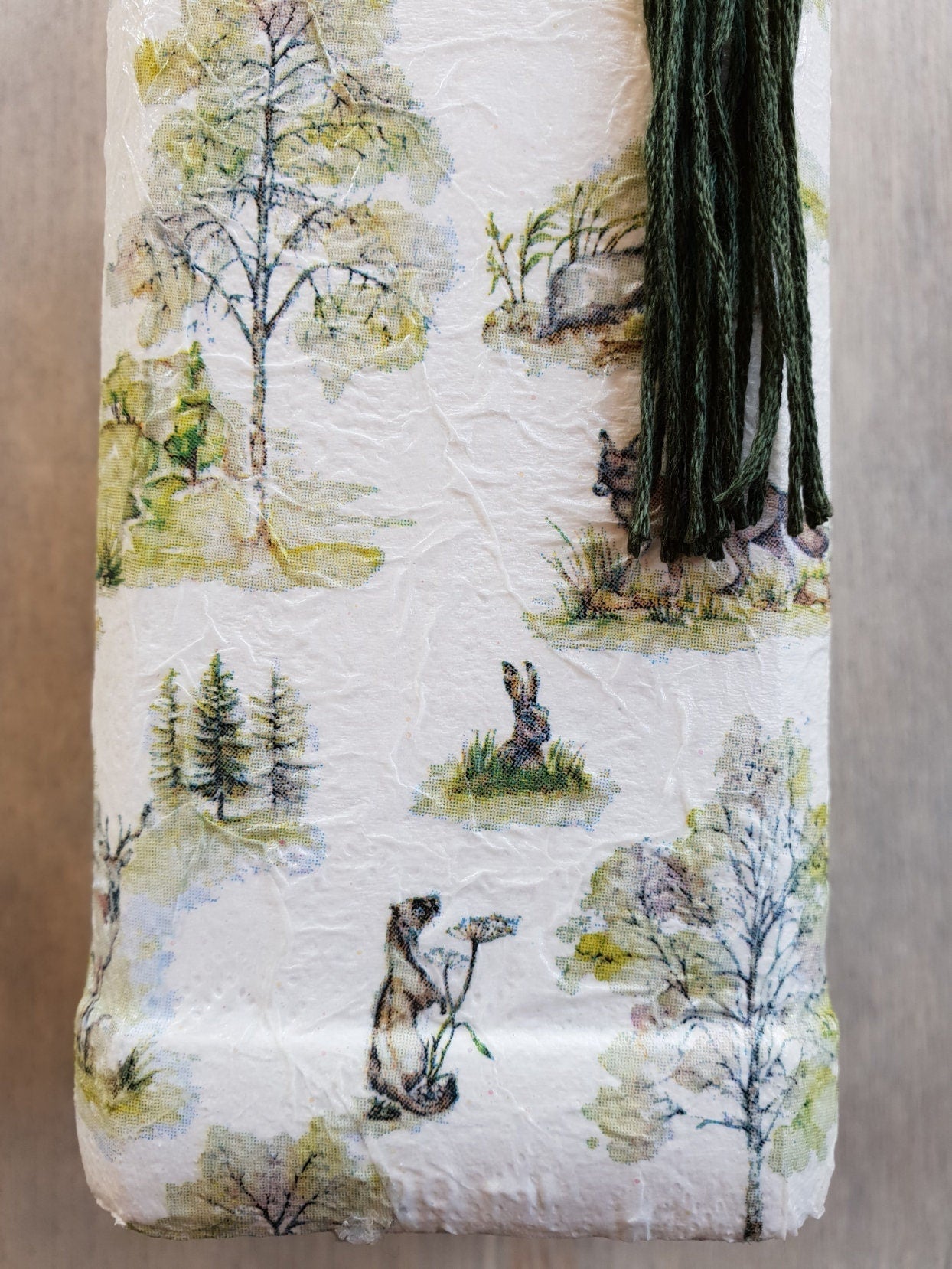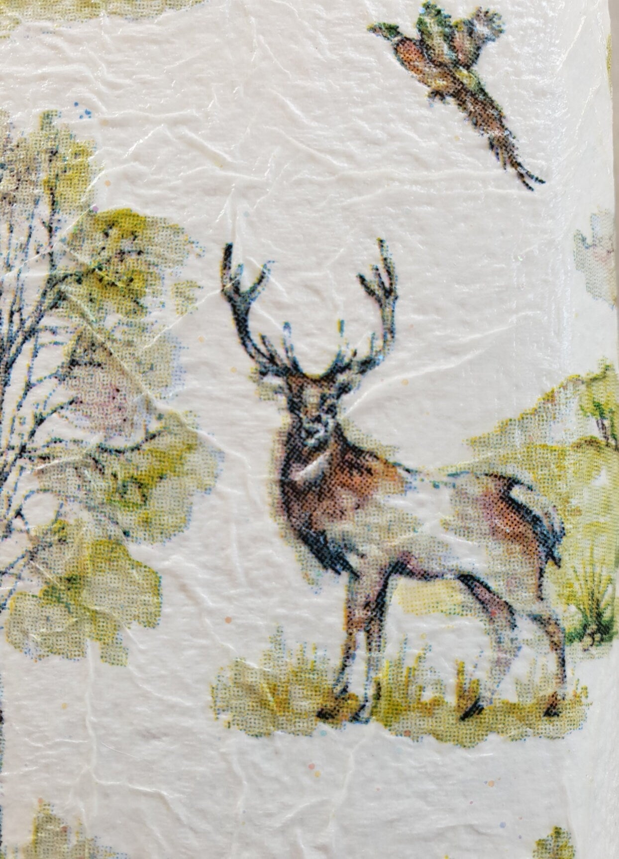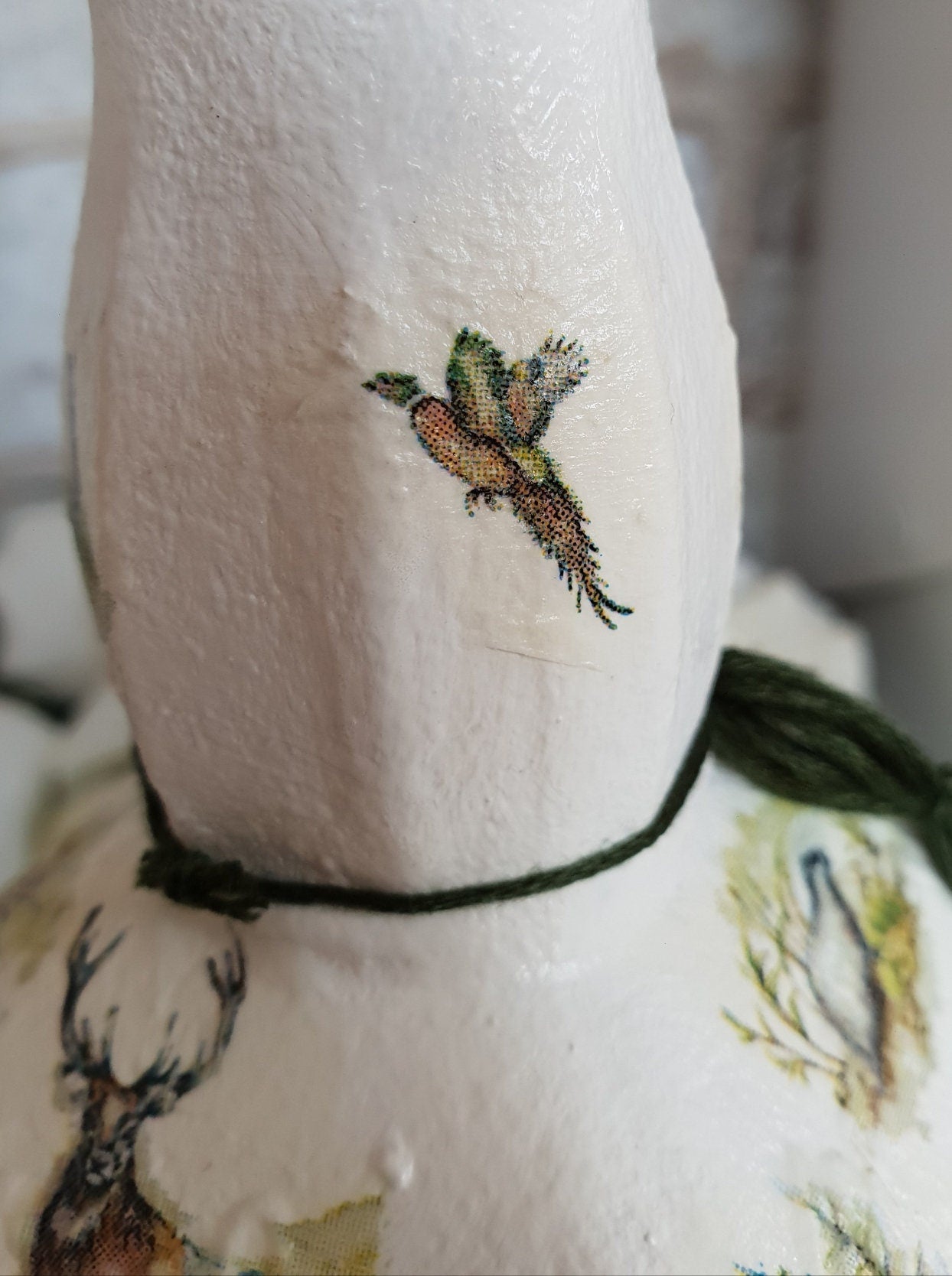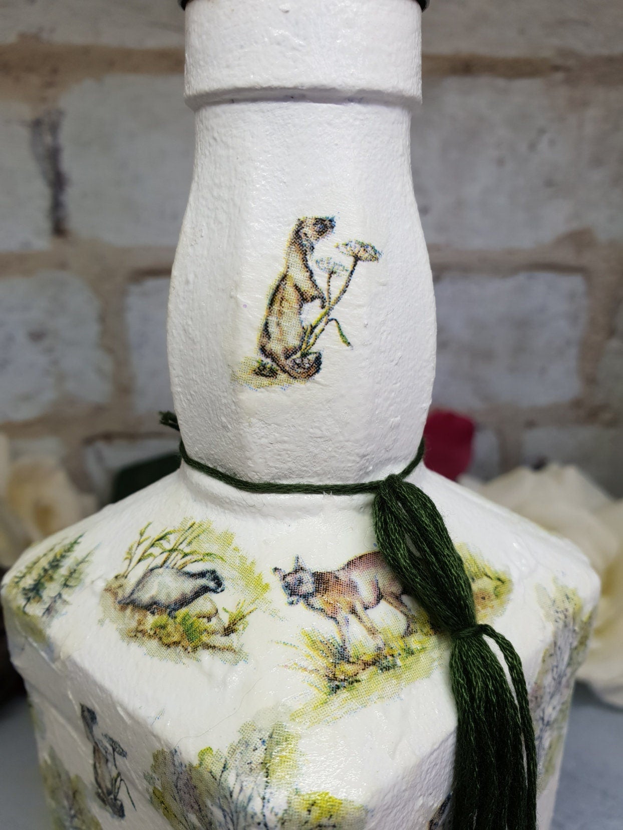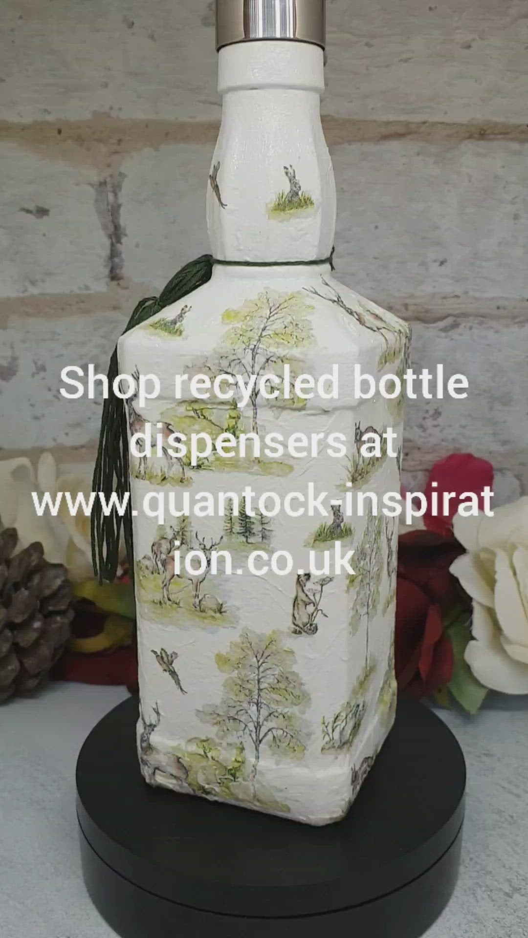 This is a recycled Jack Daniels whiskey glass bottle. I have painted the bottle with three coats of white acrylic paint and then decoupaged a woodland design onto the bottle using paper napkins and a gel medium sealer. I have added a green decorative tassel and silver coloured screw top pump dispenser to the top. The pipe has been extended inside the bottle by using another piece of pipe to make it reach to the bottom.